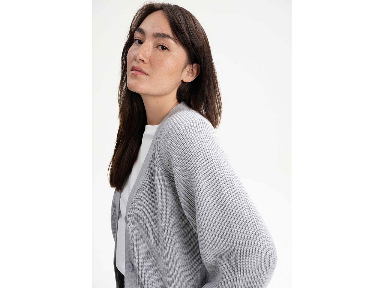 Perfekt, wenn es etwas frischer ist oder man das Outfit aufpeppen will: Dieser Rippstrick-Cardigan ist unglaublich bequem und ein echtes Must-have für den Kleiderschrank! Er ist aus gekämmter Bio-Baumwolle gefertigt und sitzt locker am Körper. Der V-Ausschnitt sorgt für eine gewisse Eleganz. Lässigkeit bringen die Raglan-Ärmel mit. Durch die variierende Strickstruktur hat der Cardigan eine moderne Optik. Die Steinnussknöpfe sind vegan. Da das Textil vorgewaschen ist, bleibt die Form erhalten.
