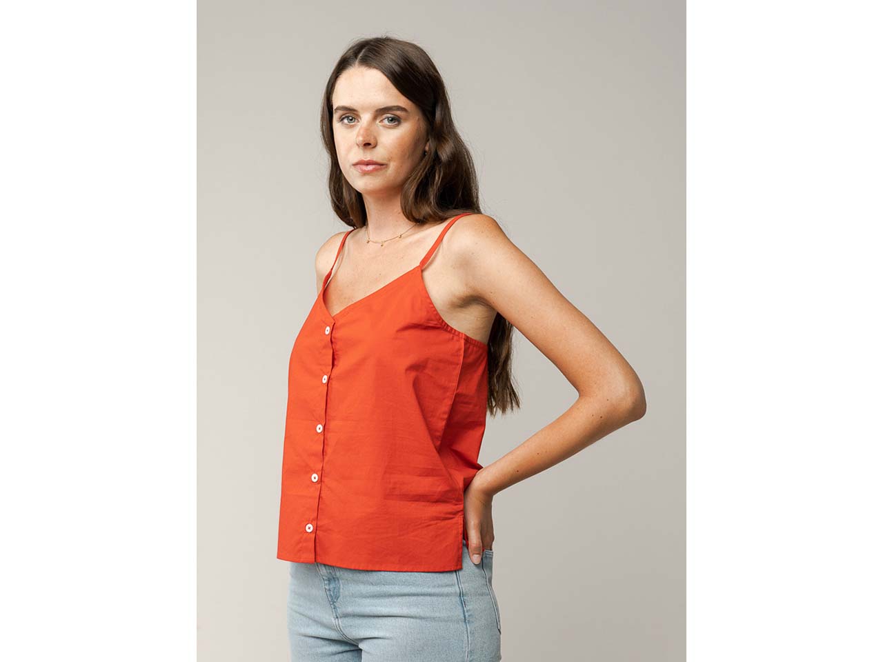Ein Hauch von verspieltem, sommerlichem Charme macht dieses Oberteil zu etwas ganz Besonderem. Das Top aus gekämmter Bio-Baumwolle in GOTS- und Fairtrade-zertifizierter Qualität ist luftig und fühlt sich angenehm weich auf der Haut an. Die dünnen Träger schneiden nicht ein und unterstreichen den lässigen Look. Modische Highlights sind der V-Ausschnitt und die fortlaufende Knopfleiste, die mit Flussperlmuschel-Knöpfen besetzt ist. Das Damen-Top von MELA ist ein echter Allrounder und passt so zu Röcken, Shorts, Bermudas oder Jeans. Der Stoff ist vorgewaschen, sodass die Passform erhalten bleibt.