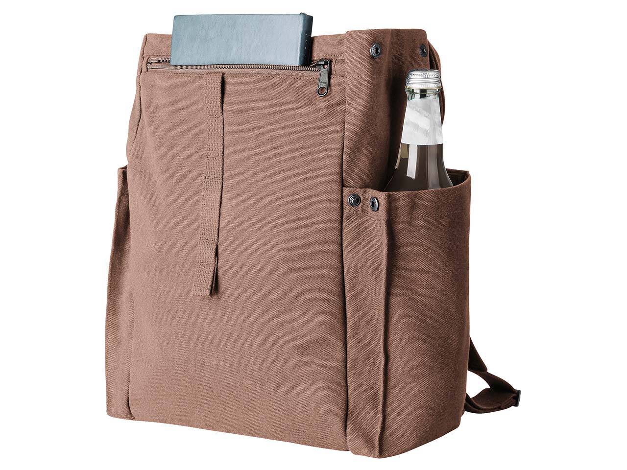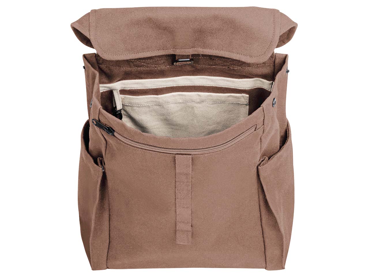 Um die wasserabweisende Funktion des Baumwoll-Canvas zu unterstützen, sollte der Rucksack zwischendurch mit einem Imprägnierspay behandelt werden.