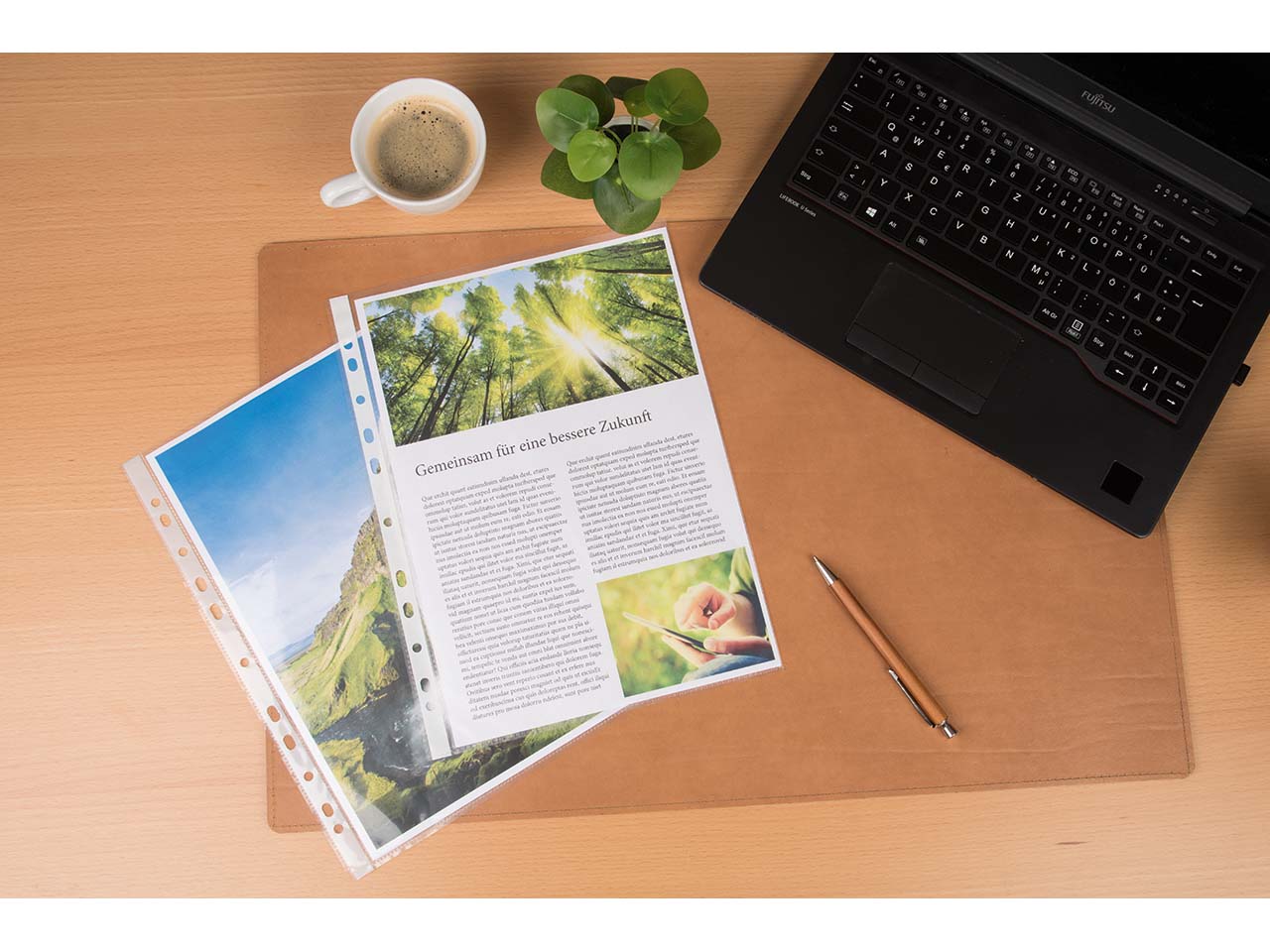 Die Prospekthüllen mit zwei offenen Seiten ermöglichen den schnellen Zugriff auf Dokumente darin - ein komfortabler Vorteil gerade bei Unterlagen, die häufiger aktualisiert werden müssen. Die Hüllen sind für Format DIN A4 geeignet. Sie bestehen aus transparenter Polypropylenfolie und sind 70 µ stark. Ideal für die Ablage ungelochter Dokumente. Dank ihrer 11-fachen Universallochung sind sie sowohl in Ordnern als auch in Ringbüchern universell geeignet.