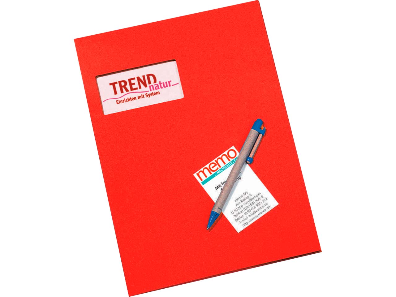 Mit der Recyclingkarton-Angebotsmappe von memo präsentieren Sie Ihre Unterlagen optimal. Praktischerweise besitzt die Mappe ein Fenster, sodass deutlich wird, was sich in ihr befindet. Format DIN A4, Grammatur 350 g/m². B 210 x H 300 mm. Farbe rot.