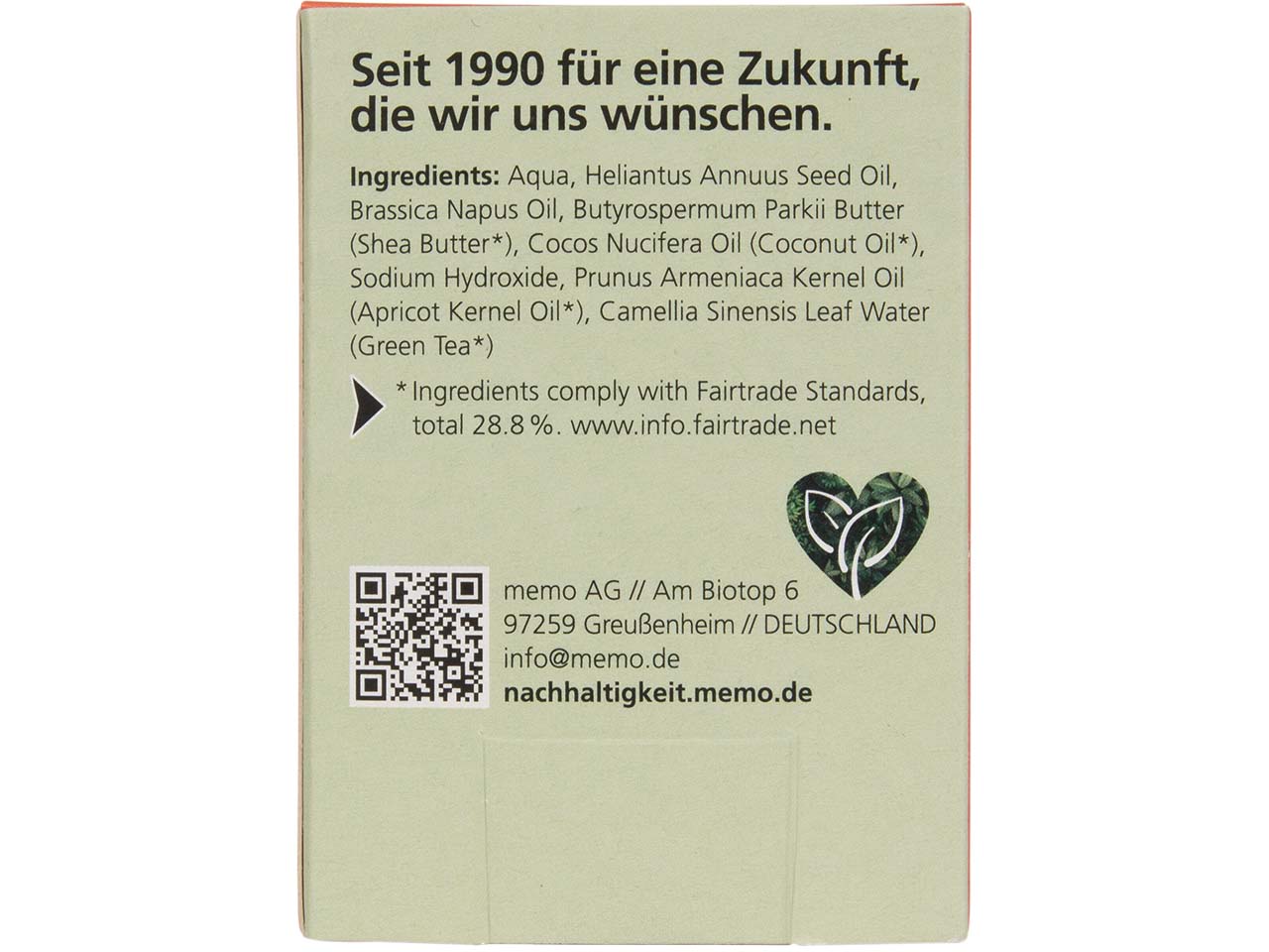 Aqua, Heliantus Annuus Seed Oil, Brassica Napus Oil, Butyrospermum Parkii Butter (Shea Butter*), Cocos Nucifera Oil (Coconut Oil*), Sodium Hydroxide, Prunus Armeniaca Kernel Oil (Apricot Kernel Oil*), Camellia Sinensis Leaf Water (Green Tea*) Der Fairtrade Anteil beträgt 28,8% (Coconut Oil 11,6%, Shea Butter 13,4%, Apricot Oil 3,3%, Grüntee 0,5%) |