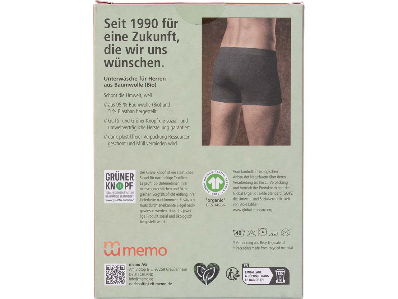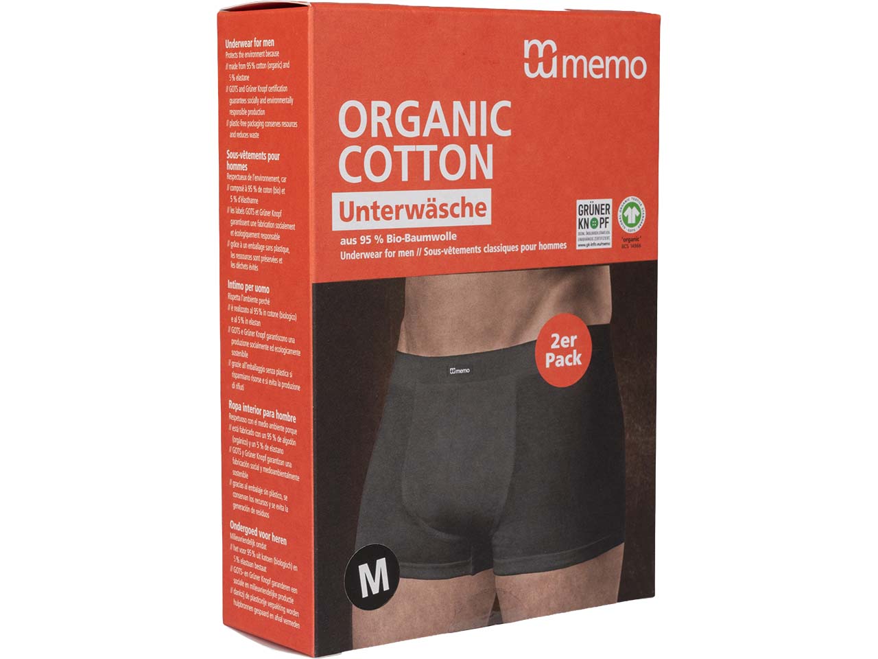 Der klassische Schnitt und der ausgezeichnete Tragekomfort zeichnen die bequemen memo Bio-Pants für Herren aus. 95 % GOTS-zertifizierte Bio-Baumwolle und 5 % Elasthan sorgen für exzellente Formstabilität. Die Nähte tragen nicht auf. Unterhose ohne Eingriff. 1 Pack = 2 Stk.