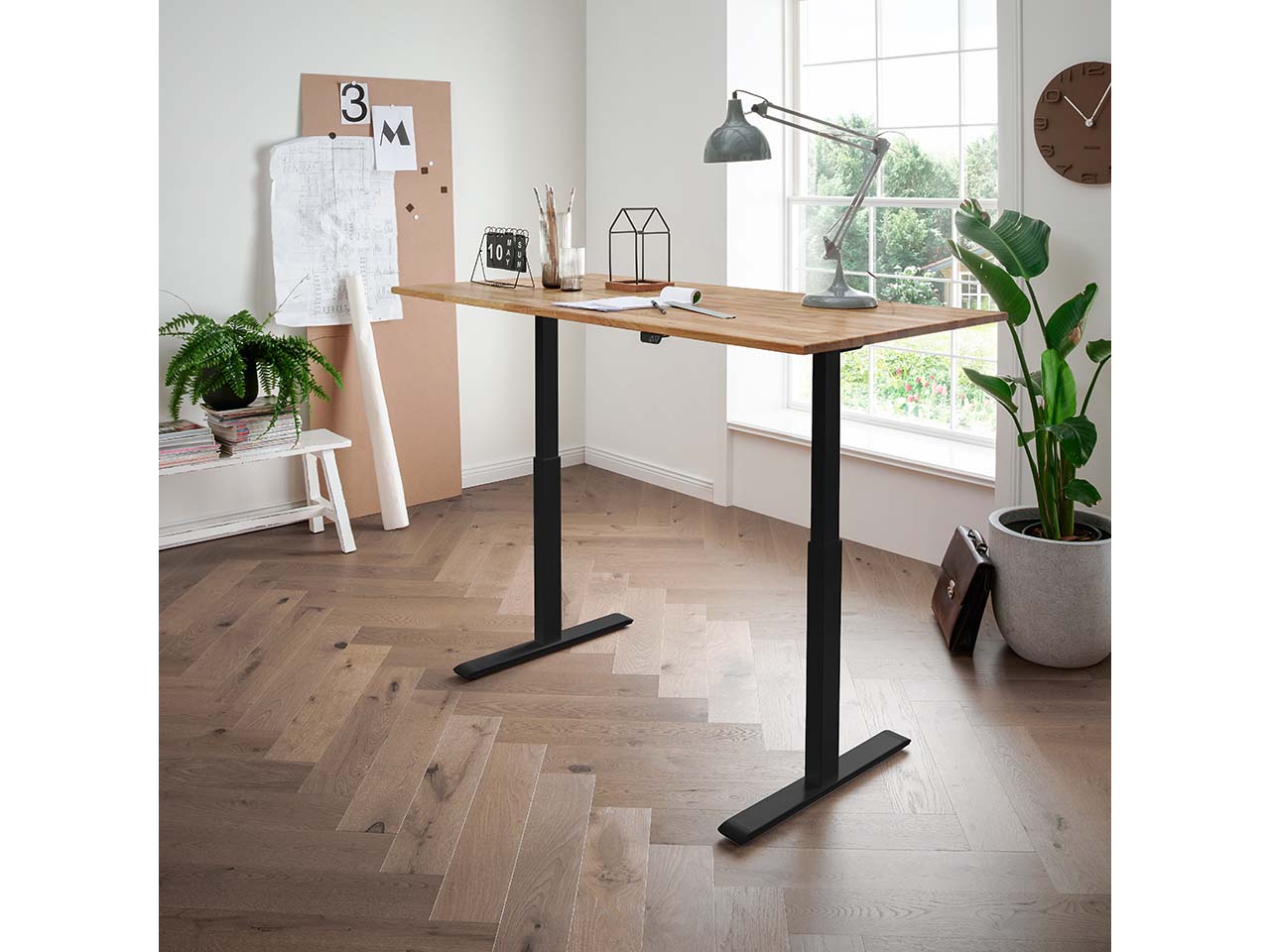 Der Schreibtisch gehört zu den wichtigsten Möbelstücken im Büro und im Home Office. Vor allem der Ergonomie kommt eine wichtige Rolle zu, denn sonst ist konzentriertes Arbeiten kaum möglich. Die Lösung? Ein Schreibtisch wie dieser, der sich ganz einfach in der Höhe verstellen lässt! Die Höhenverstellung erfolgt elektrisch und per hochwertigem, zweimotorigem Antrieb des Bosch Motors. Die Höhe lässt sich zwischen 70-120 cm einstellen, sodass jede:r Nutzer:in optimal am Tisch sitzt. Praktisch: Die Lieblingshöhe kann dank Memory-Funktion gespeichert werden. Der Schreibtisch eignet sich ideal, um abwechselnd sitzend und stehend zu arbeiten. Im Design ist er minimalistisch gehalten: Das platzsparende T-Gestell in ansprechendem Schwarz harmoniert exzellent mit der Tischplatte aus geöltem Massivholz. Die Eiche punktet mit kontrastreicher, intensiver Maserung, die besonders wild und lebendig wirkt. T 70 cm, erhältlich in unterschiedlichen Breiten.