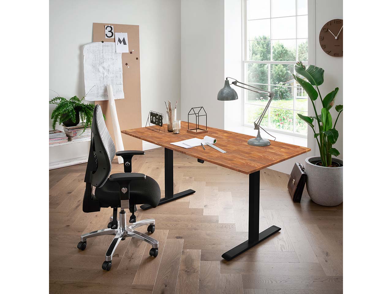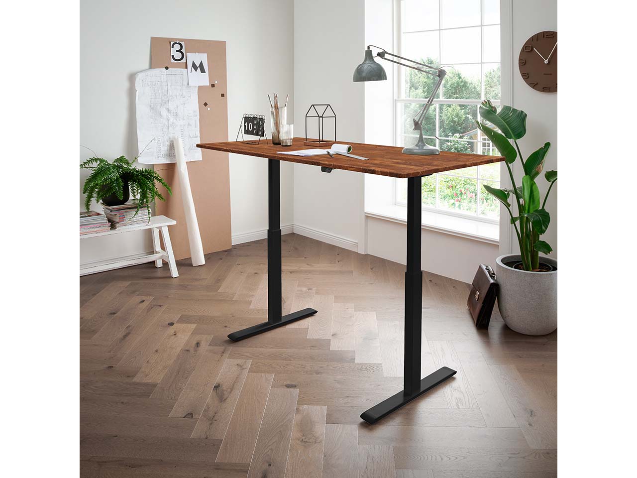 Der Schreibtisch gehört zu den wichtigsten Möbelstücken im Büro und im Home Office. Vor allem der Ergonomie kommt eine wichtige Rolle zu, denn sonst ist konzentriertes Arbeiten kaum möglich. Die Lösung? Ein Schreibtisch wie dieser, der sich ganz einfach in der Höhe verstellen lässt! Die Höhenverstellung erfolgt elektrisch und per hochwertigem, zweimotorigem Antrieb des Bosch Motors. Die Höhe lässt sich zwischen 70-120 cm einstellen, sodass jede:r Nutzer:in optimal am Tisch sitzt. Praktisch: Die Lieblingshöhe kann dank Memory-Funktion gespeichert werden. Der Schreibtisch eignet sich ideal, um abwechselnd sitzend und stehend zu arbeiten. Im Design ist er minimalistisch gehalten: Das platzsparende T-Gestell in ansprechendem Schwarz harmoniert exzellent mit der Tischplatte aus geöltem Massivholz. Die feine Maserung des gelblich bis goldenen Robinienholzes wirkt besonders edel. T 70 cm, erhältlich in unterschiedlichen Breiten.