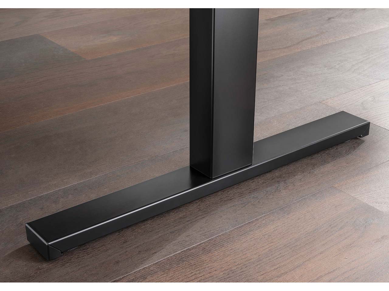 An diesem Schreibtisch muss man nicht den ganzen Tag sitzen, denn er ist höhenverstellbar. Abwechselnd sitzend und stehend zu arbeiten hat viele Vorteile. Unter anderem bleibt die Konzentration erhalten. Ein Druck auf den blau beleuchteten Handschalter genügt und die Tischplatte hebt oder senkt sich fast geräuschlos. Doch der Schreibtisch ist nicht nur unglaublich funktional, er punktet auch mit seinem minimalistischen und langlebigen Design. Die Tischplatte besteht aus Massivholz. Sie ruht auf einem hochwertigen, stabilen T-Gestell aus pulverbeschichtetem Stahl. Das Gestell bietet viel Platz, um z.B. einen Rollcontainer unter dem Tisch zu platzieren. Die Elektrotechnik des Tisches ist in der Säule integriert. Beim Technikstandard des Schreibtisches handelt es sich wie bei Haushaltsgeräten um Level C. Mit einer Verstellgeschwindigkeit von 70 mm/s ist die Tischplatte schnell hoch- und heruntergefahren. Dabei ist die Lärmbelastung mit 39 dB gering. Die Fußabdeckung aus Metall unterstreicht das durchdachte Design. Tiefe 80 cm, erhältlich in verschiedenen Breiten und Holzarten.