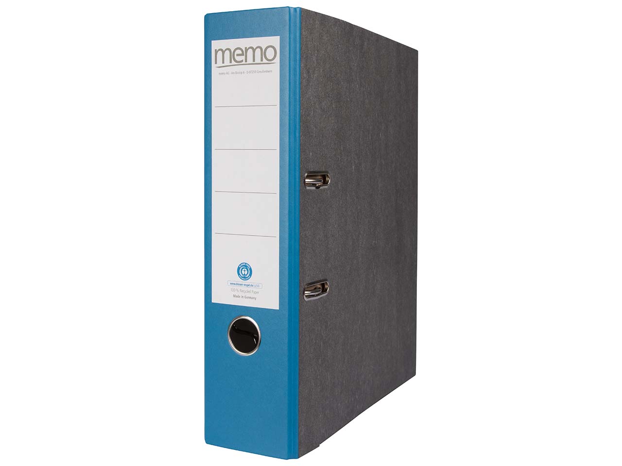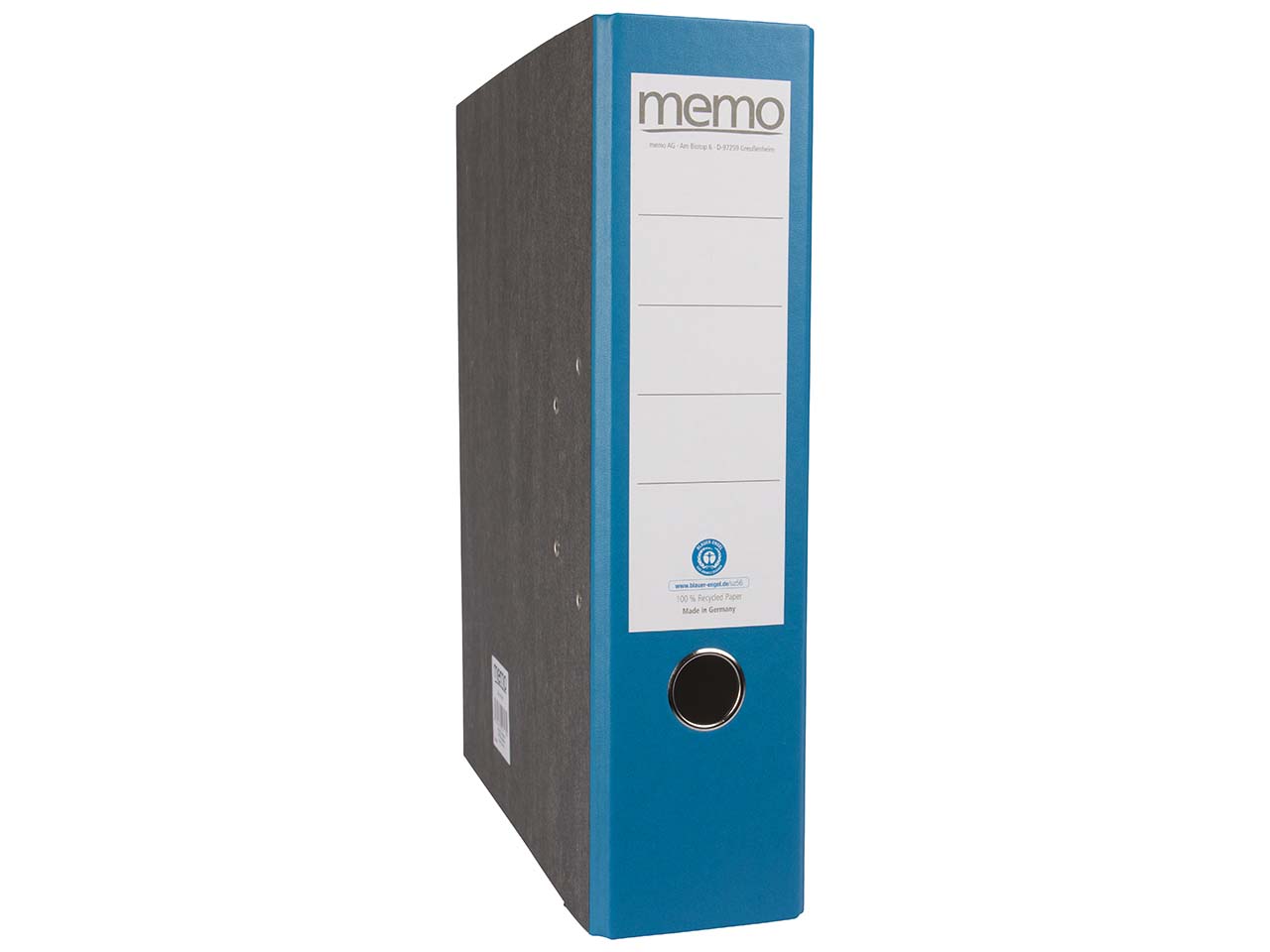 memo Ordner mit stabilem Kantenschutz, Raumsparschlitzen und Griffloch. Pappkern, Bezugspapier und Rückenschild aus 100 % Recyclingpappe. Ausgezeichnet mit dem Blauen Engel. Aus deutscher Fertigung. Für Format DIN A4. Rückenbreite 8 cm. Rückenfarbe blau.
