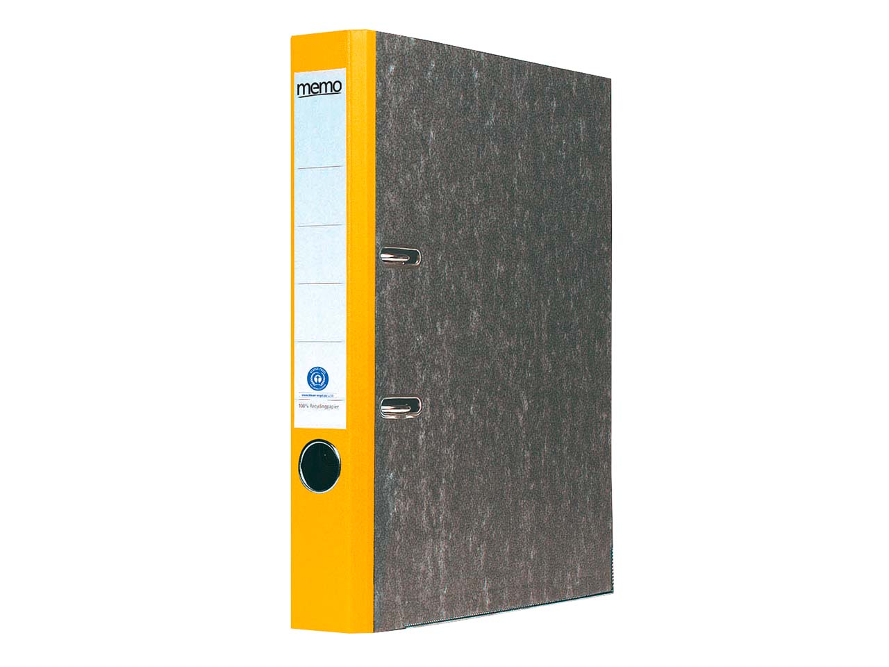 Stabiler Ordner von memo aus Recyclingmaterial. Hebelmechanik mit Ganzmetall-Niederhalter und Zapfen-Sicherheitsverschluss. Mit stabilem Kantenschutz, Raumsparschlitzen und Griffloch. Außenbezug aus Wolkenmarmorpapier. Für Format DIN A 4. T 28,5 x H 32 cm. Rückenbreite 5 cm. Farbe gelb.