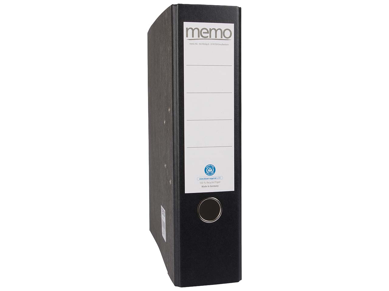 memo Ordner mit stabilem Kantenschutz, Raumsparschlitzen und Griffloch. Pappkern, Bezugspapier und Rückenschild aus 100 % Recyclingpappe. Ausgezeichnet mit dem Blauen Engel. Aus deutscher Fertigung. Für Format DIN A4. Rückenbreite 8 cm. Rückenfarbe schwarz.