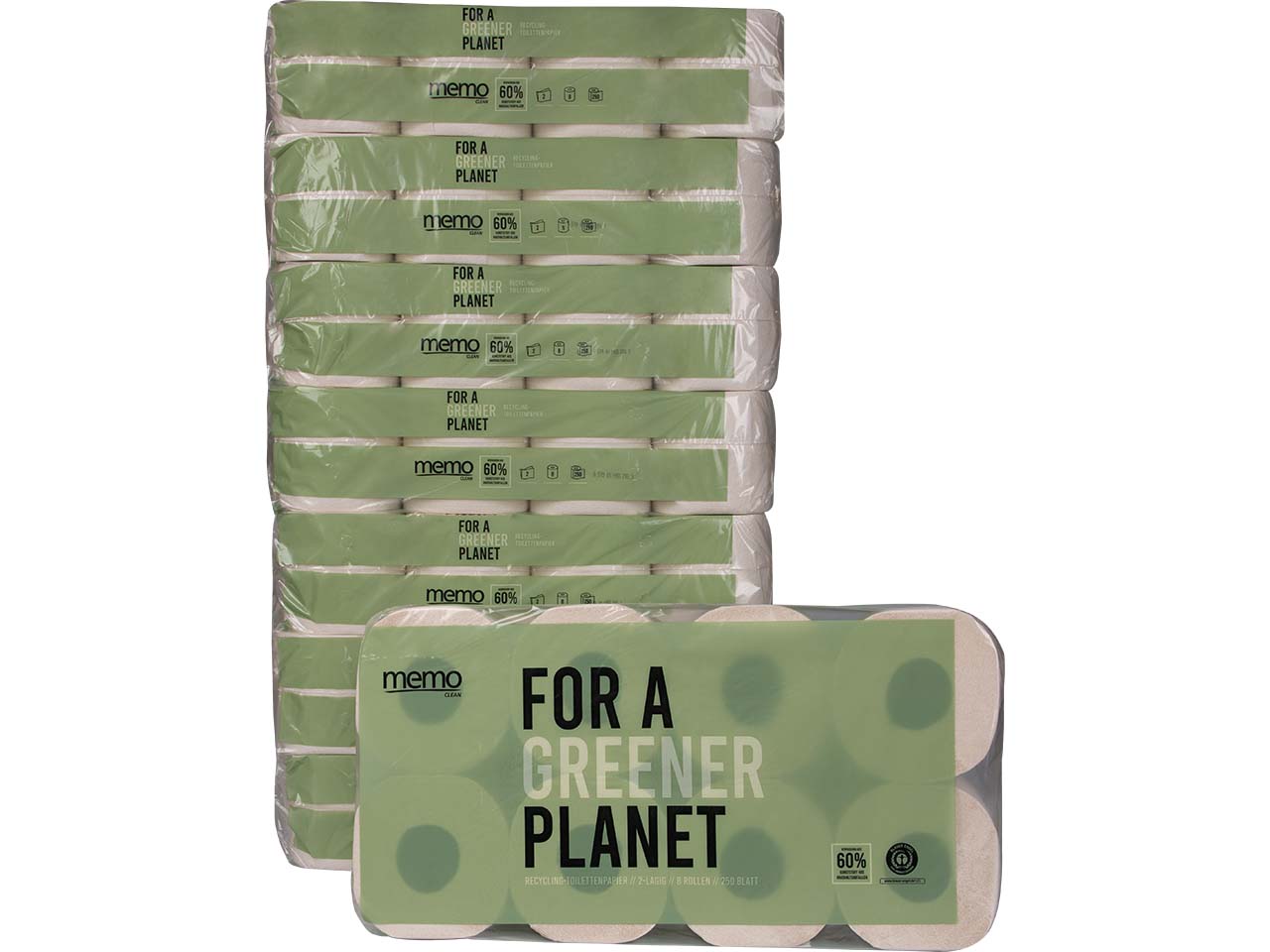 memo Toilettenpapier "Recycling-Tissue" wird ohne Zusatz von optischen Aufhellern aus 100 % recycelten Papierfasern hergestellt. Durch die innovative Volumenprägung besonders weich und reißfest. Es sind jeweils 8 Rollen in Kunststoff umverpackt und alle Packungen werden mit Kunststofffolie zusammengehalten. 1 Sack = 8 x 8 Rollen. Farbe weiß.