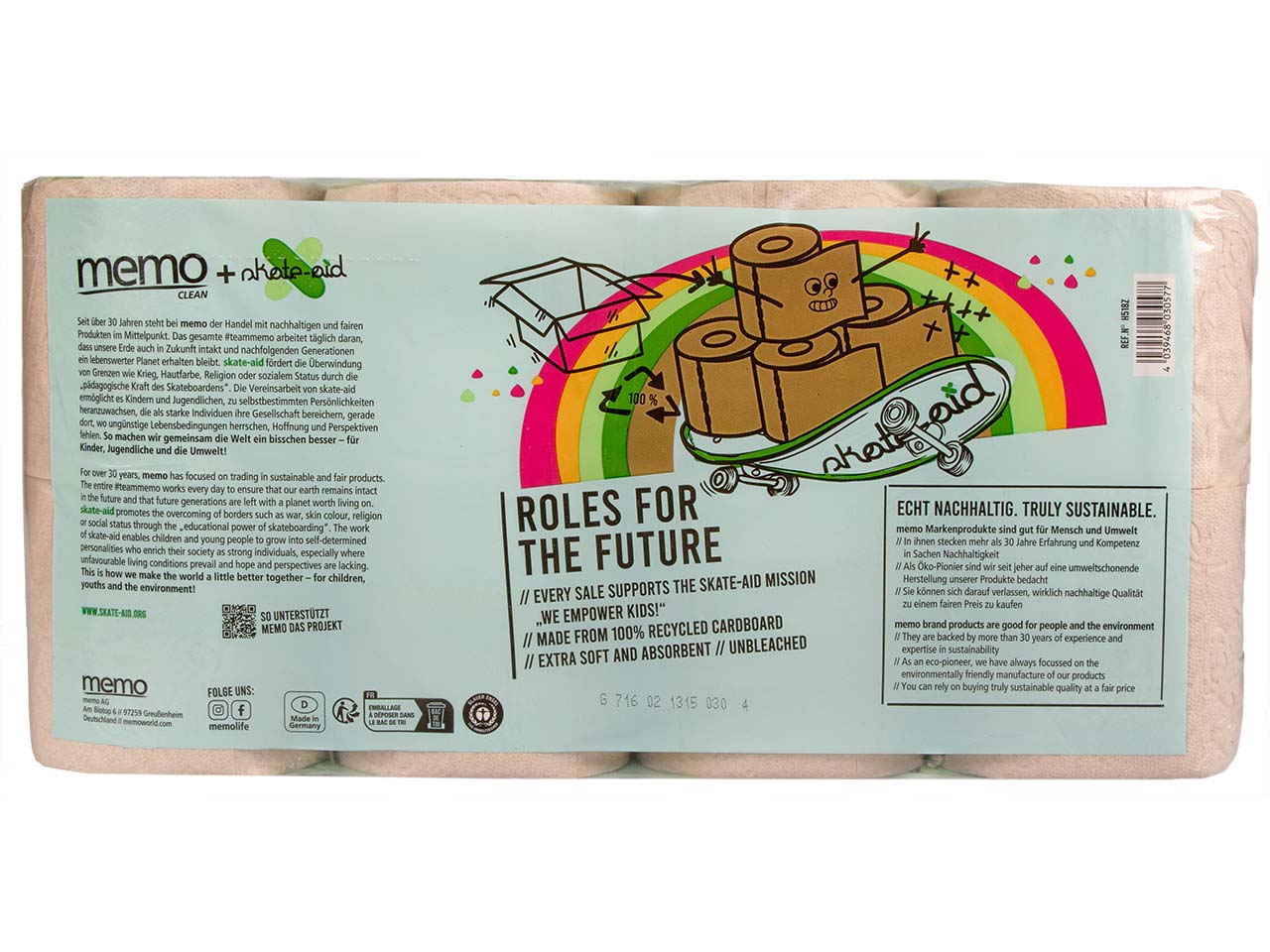 „Wir machen Kinder stark!“ ist das Motto von skate-aid. In weltweiten Projekten wird die Kraft des Skateboardens genutzt, um Sozialisations-, Präventions- und Friedensarbeit dort zu leisten, wo junge Menschen sozialen Missständen und schwierigen Lebenssituationen ausgesetzt sind. Genau das eint memo und skate-aid: Beide möchten mit ihrem Handeln die Welt ein Stück besser machen. Aus diesem Grundgedanken heraus ist in enger Zusammenarbeit das Kooperationsprodukt „Rollen für die Zukunft“ entstanden. Das Toilettenpapier von der memo Eigenmarke überzeugt mit hohen Qualitäts- und Nachhaltigkeitsstandards, die im Sortiment eine Neuheit darstellen.