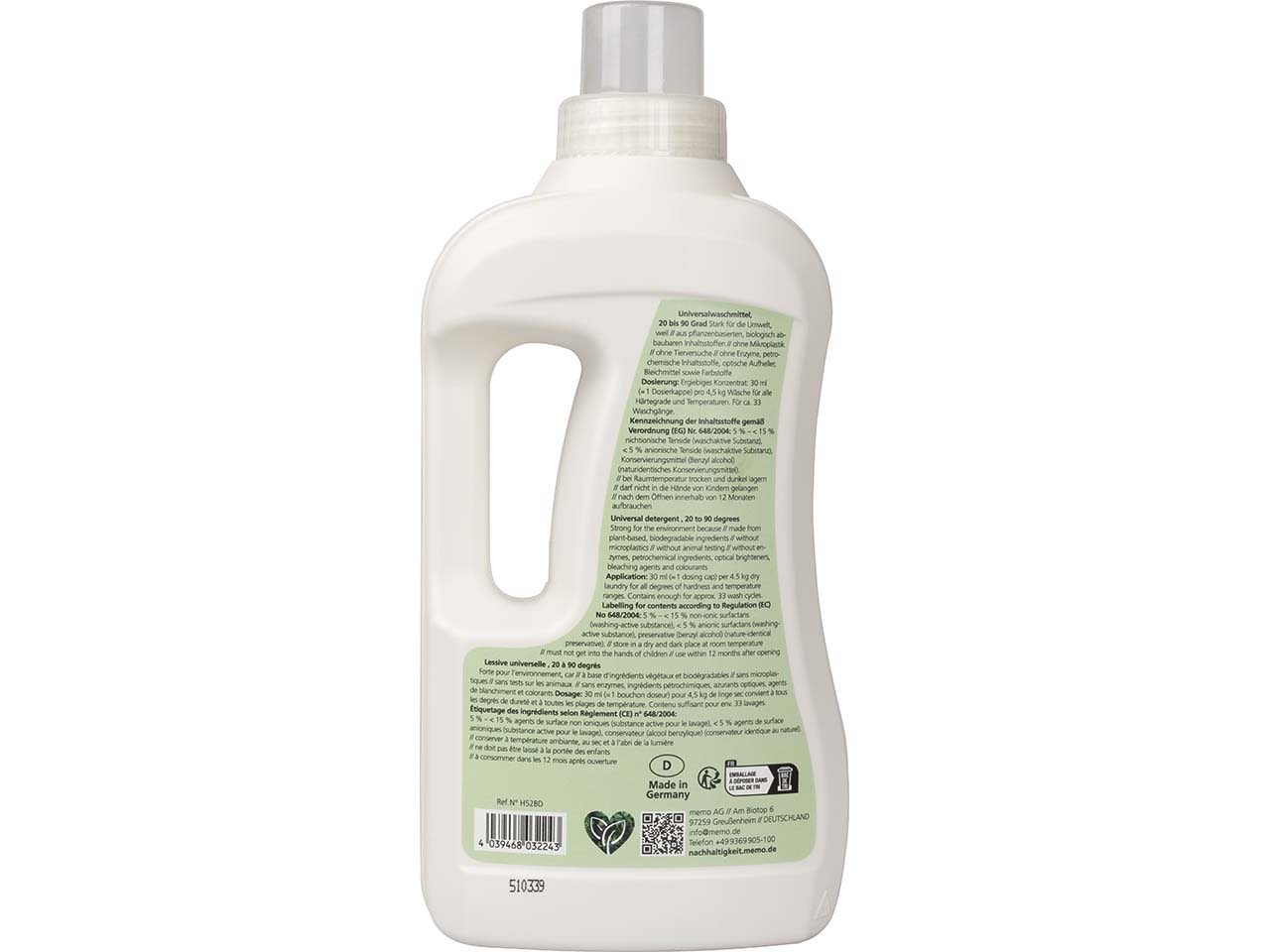 Sämtliche Inhaltsstoffe des veganen und tierversuchsfreien Waschmittels sind natürlichen Ursprungs. Das enthaltene Seifenkraut wirkt effektiv gegen Schmutz, Fett und Flecken. Dabei achtet memo nicht nur auf die Umweltverträglichkeit des Reinigungsmittels, sondern auch auf eine besonders umweltschonende Verpackung: Der Flaschenkorpus besteht zu 100 % aus Recyclingkunststoff.