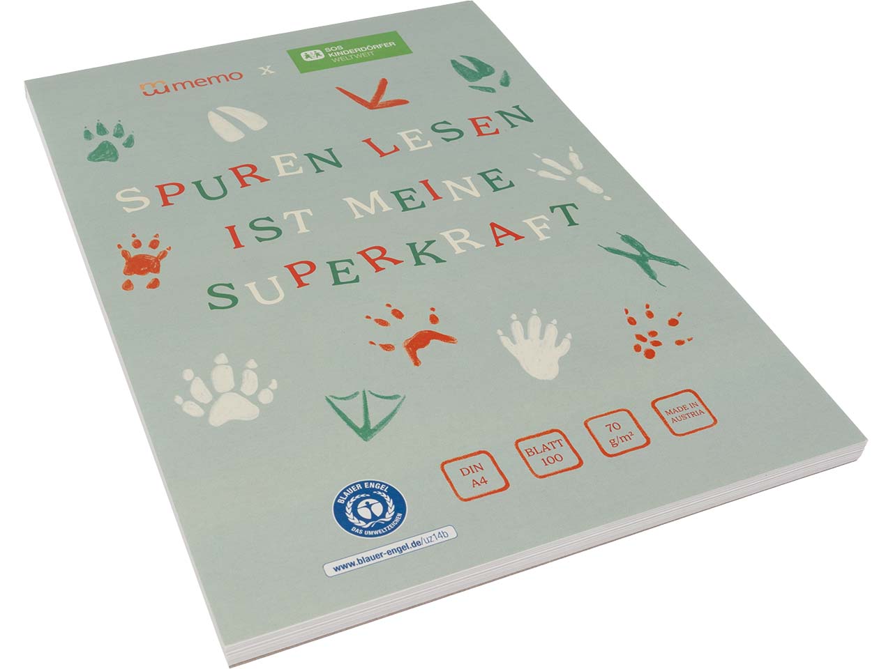 Jedes Kind hat Wünsche und Hoffnungen – genau diese finden sich auf dem Malblock, der aus einer Kooperation von memo und SOS-Kinderdörfer weltweit entstanden ist. Die unabhängige, nichtstaatliche und überkonfessionelle Kinderrechtsorganisation hat es sich zur Aufgabe gemacht, verlassene und Not leidende Kinder mit Bildung, medizinischer Versorgung und Unterstützung in eine bessere Zukunft zu begleiten. Der farbenfrohe Block erzählt die Geschichte von Ante, der in einem SOS-Kinderdorf in Kroatien lebt. Seine Superkraft ist das Lesen von Spuren. Kinder können mit dem Block ihre eigene Fantasie und ihre Superkräfte entdecken. Gleichzeitig lernen sie etwas über Kinder in anderen Teilen der Welt. Vorteilhaft für Mensch und Umwelt: Der mit dem Blauen Engel ausgezeichnete Malblock besteht zu 100 % aus Recyclingpapier. Format DIN A4, Grammatur 70 g/m².