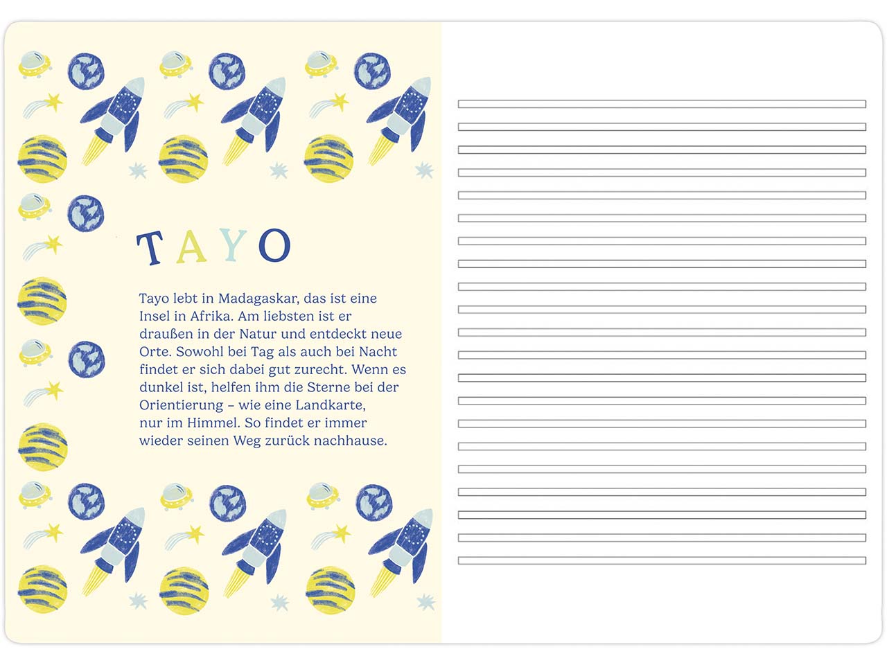 Orientieren – das ist die Superkraft von Tayo. Die Geschichte des Kindes, das in einem der SOS-Kinderdörfer aufgewachsen ist, soll andere Kinder inspirieren, ihre eigene Superkraft zu entdecken. Die Kinderrechtsorganisation und memo haben sich zusammengetan und eine Reihe von Schulprodukten zusammen entwickelt, um Bildung zu fördern und Kindern zu einer besseren Zukunft zu verhelfen. Ein Teil der Einnahmen aus dem Verkauf fließt direkt in die Klima-Initiative „Eco Champions“. Das mit dem Blauen Engel ausgezeichnete DIN-A5-Schulheft aus Recyclingpapier hat die Lineatur 3 und ist damit ideal für Kinder in der dritten Klasse, die ihren Schreibstil noch perfektionieren. Die Illustrationen stammen von einer jungen Designerin, die diese handgezeichnet hat. Eine kurze, kindgerechte Geschichte erzählt Kindern, wie Tayo seine Superkraft genutzt hat.