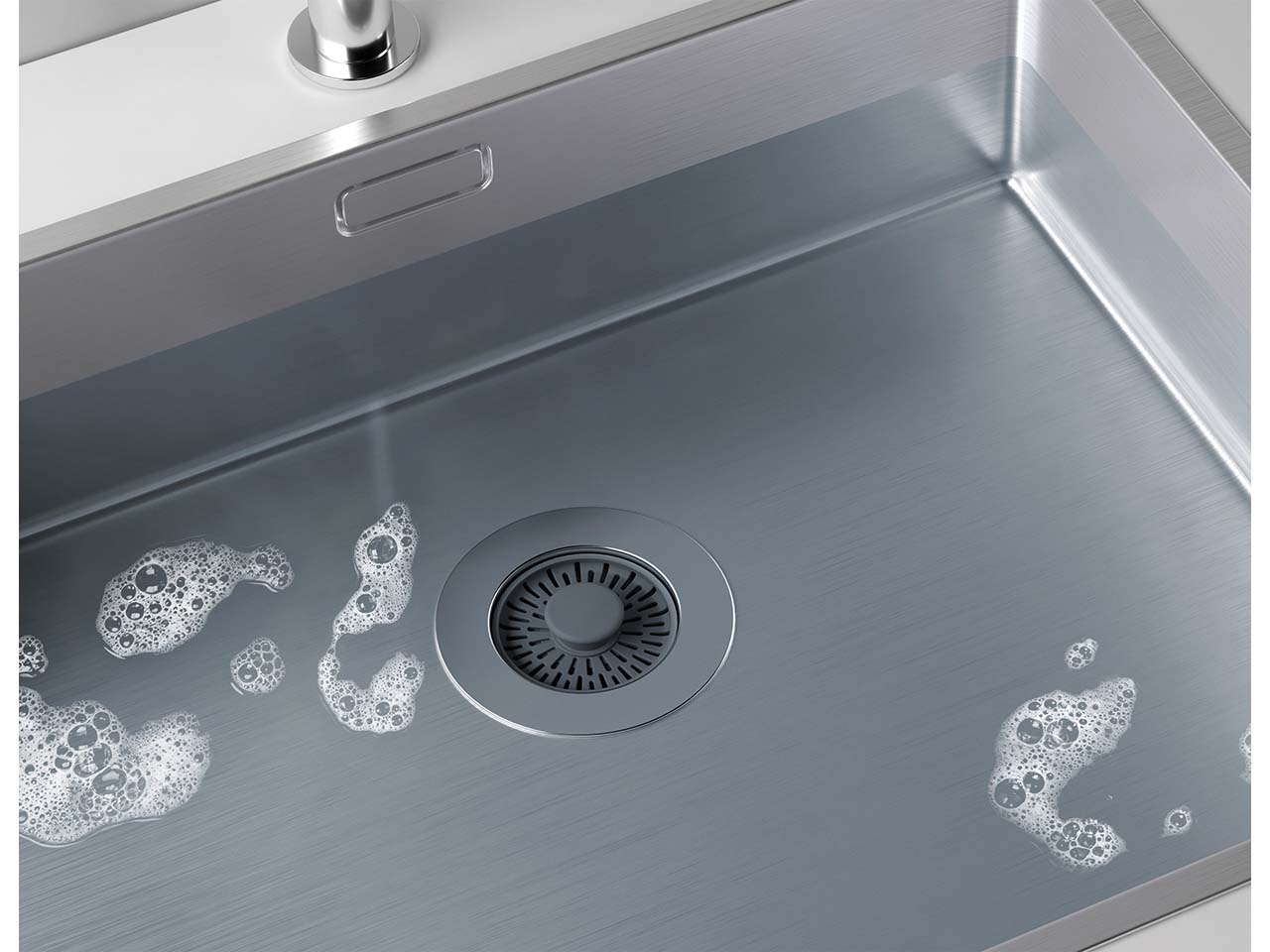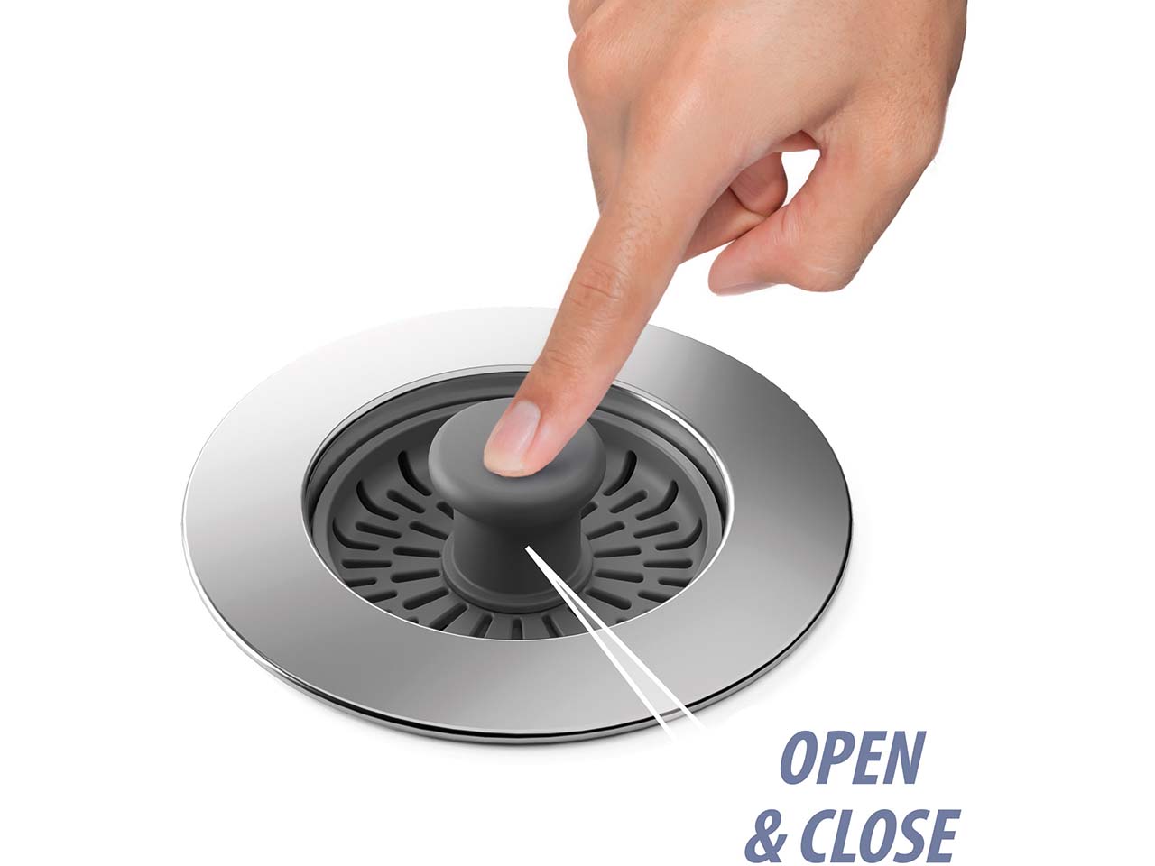 Praktischer Helfer für Spülen und Waschbecken in Küche, Bad und Co.: Das Abflusssieb mit innovativem Open-und-Close-Mechanismus lässt sich per Knopfdruck öffnen und schließen. Das integrierte Sieb fängt Speisereste, Schmutz, Haare und mehr zuverlässig auf und schützt so vor Verstopfungen. Der Edelstahlrand gewährleistet eine hohe, langlebige Qualität. Der Abflussstöpsel kann zur Reinigung in die Spülmaschine.