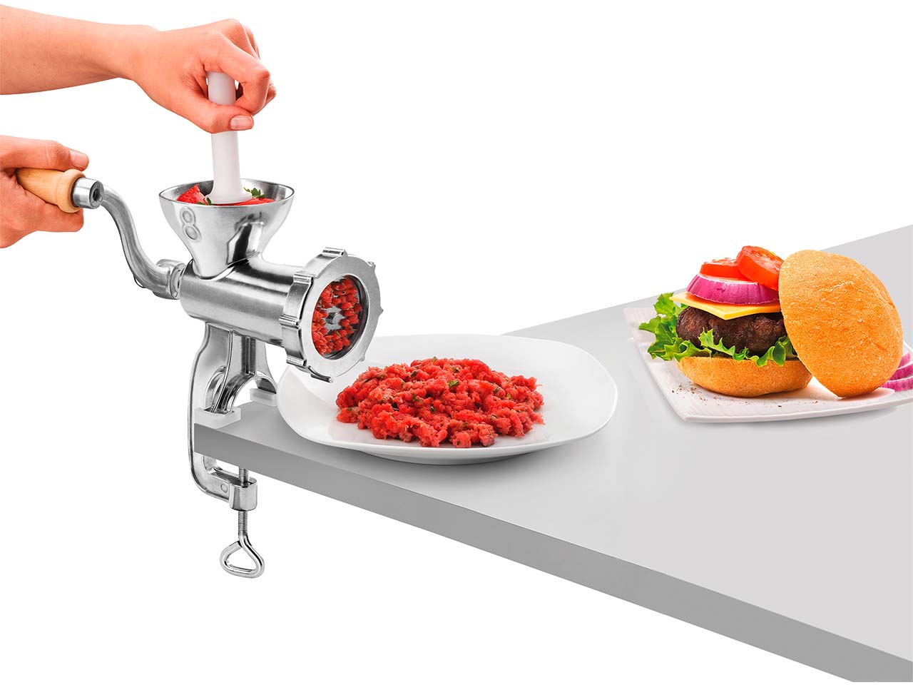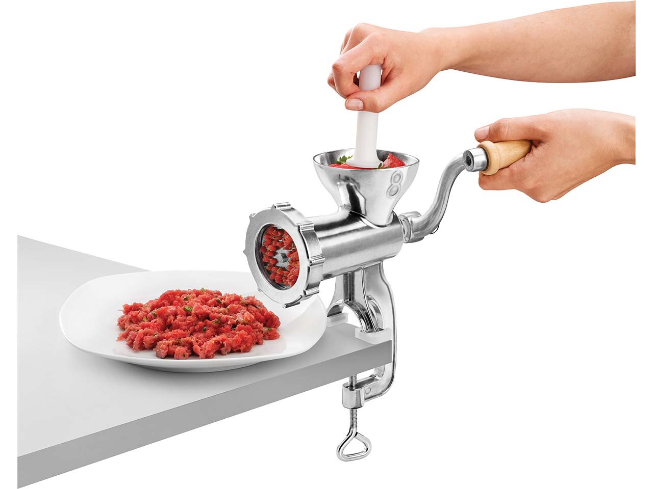 - Mit stabiler Tischbefestigung und Holzkurbel