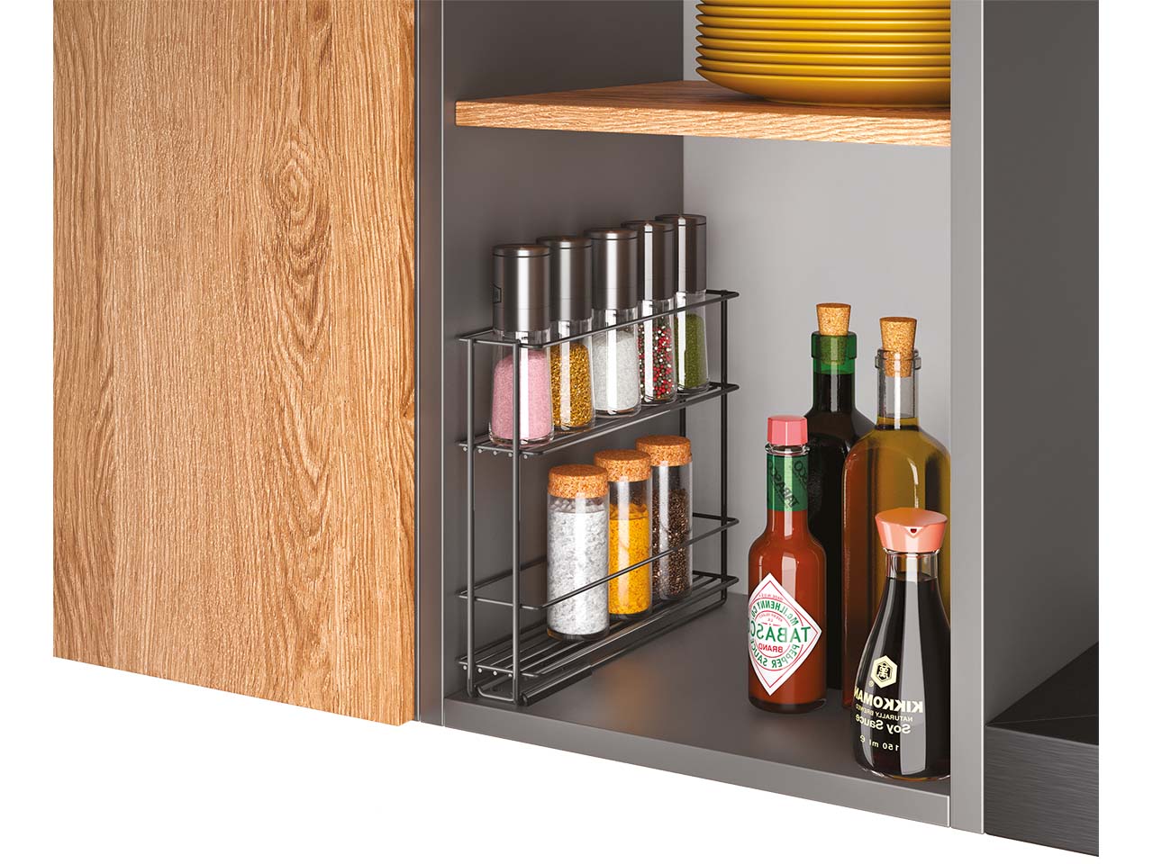 Ein kleines praktisches Platzwunder für den Küchenschrank, das Stauraum perfekt ausnutzt: In diesem Gewürzregal sind Gewürze ordentlich und stets griffbereit aufbewahrt! Bei Bedarf wird das Regal einfach herausgezogen und dann wieder zurückgeschoben. Dabei ist das Gewürzregal dank exklusiver TouchTherm-Beschichtung kratzfest und antistatisch. Die Beschichtung verleiht dem Regal eine elegante Optik. Das Gewürzregal ist ein Must-have für die Küchenorganisation!