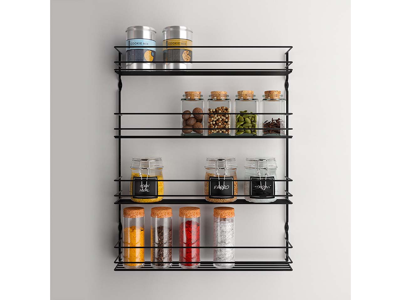 Dieses Gewürzregal sorgt für Ordnung in der Küche! Auf vier Etagen können Gewürze und Kräuter griffbereit aufbewahrt werden. Das Regal eignet sich zur Anbringung an der Wand, in einem Küchenschrank oder in einer Tür. Das Gewürzregal aus robustem Metall hat eine TouchTherm-Beschichtung, die dafür sorgt, dass der Küchenhelfer ein edles, modernes Design erhält. Gleichzeitig macht sie das Material antistatisch, rostbeständig und stoßfest. Das in Italien hergestellte Gewürzregal ist ein echtes Must-have für die Küchenorganisation.