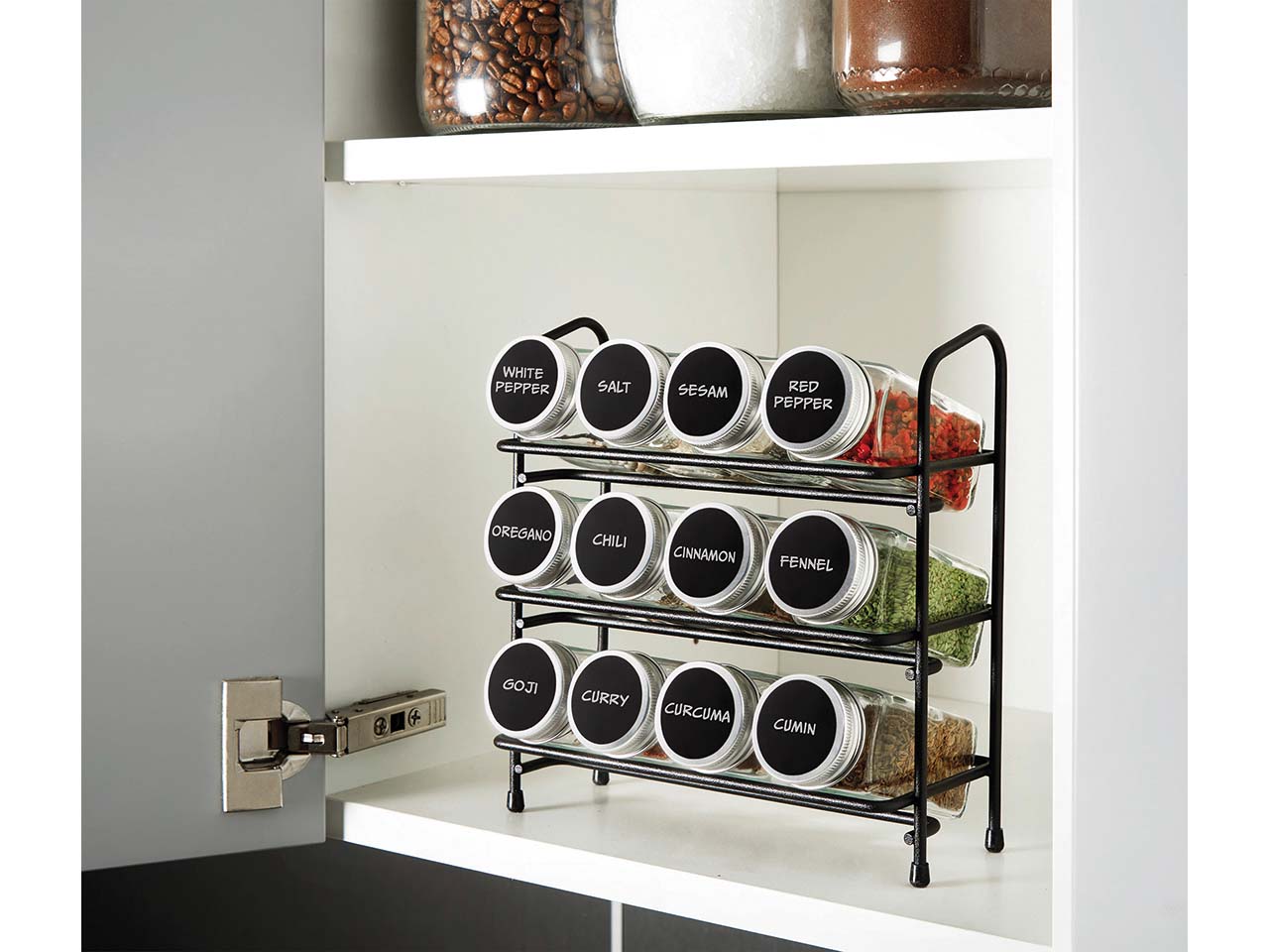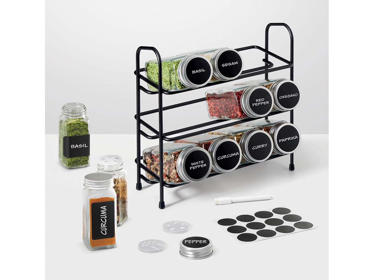 Metaltex Gewürzregal-Set mit 12 Gewürzgläsern und Beschriftungszubehör