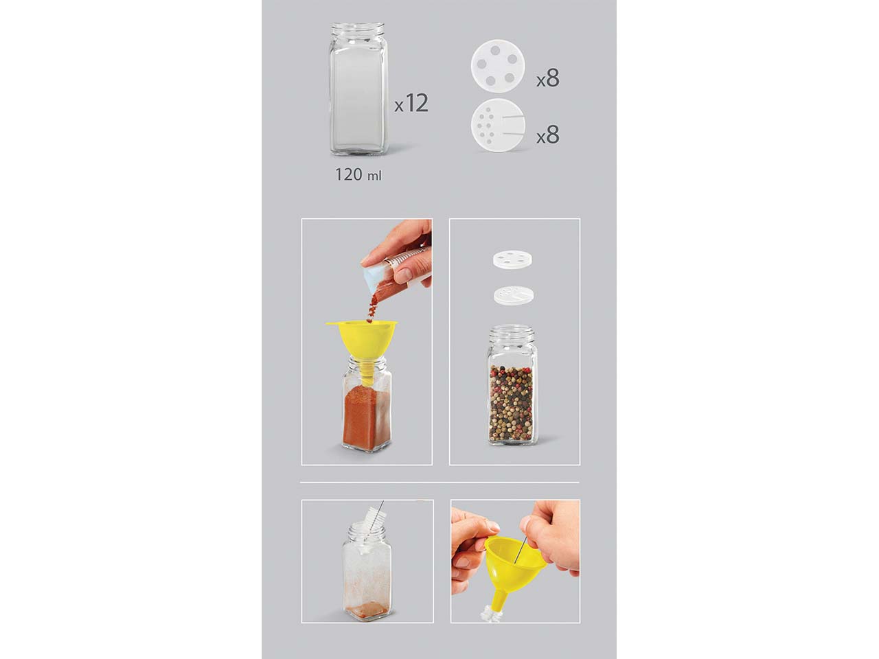 - Stabiler Metallständer mit 12 Gewürzgläsern und 24 Streueinsätzen