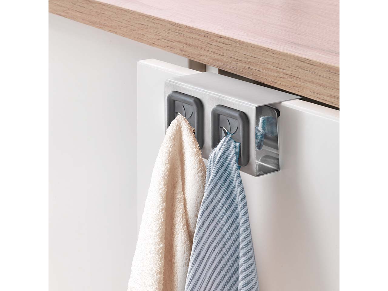 Doppelt praktisch: Diese Halterung für Handtücher, Lappen oder Geschirrtücher muss nicht montiert werden, sondern wird in Bad oder Küche einfach über eine Schranktür eingehängt! Das Tuch wird eingedrückt und bei Bedarf herausgenommen. Die robuste, langlebige Konstruktion besteht aus Edelstahl.
