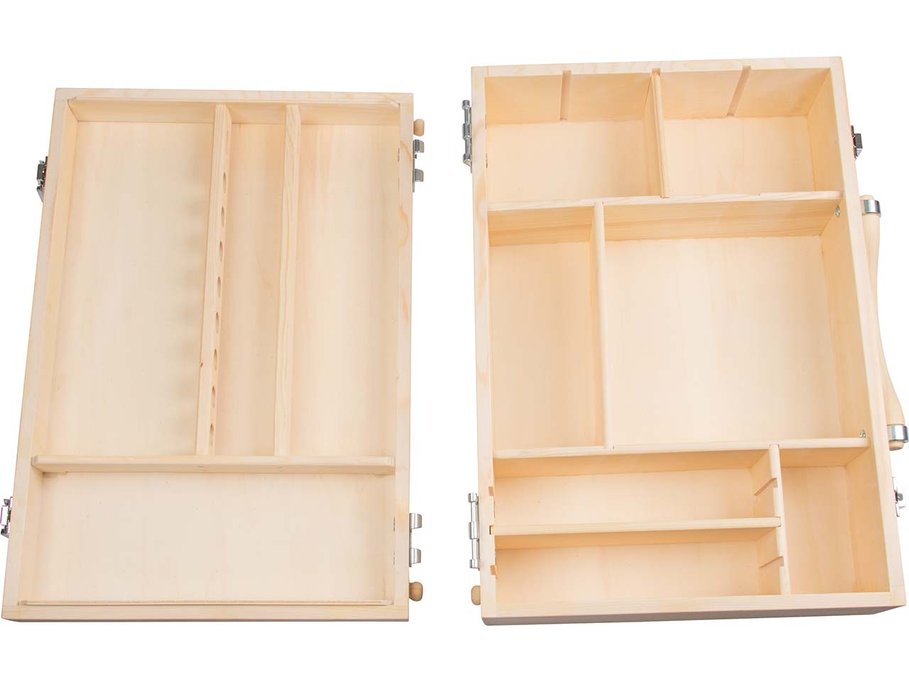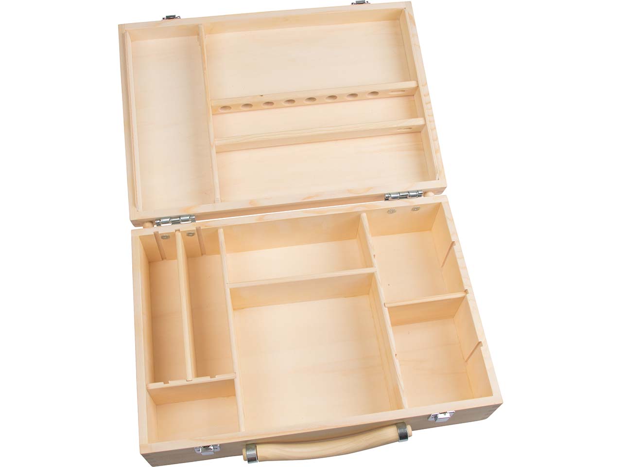 Der Moderationskoffer besteht aus massiver, gewachster Fichte. Holz stammt aus regionaler, deutscher Forstwirtschaft. Herstellung in einer Werkstatt für Menschen mit Behinderung.