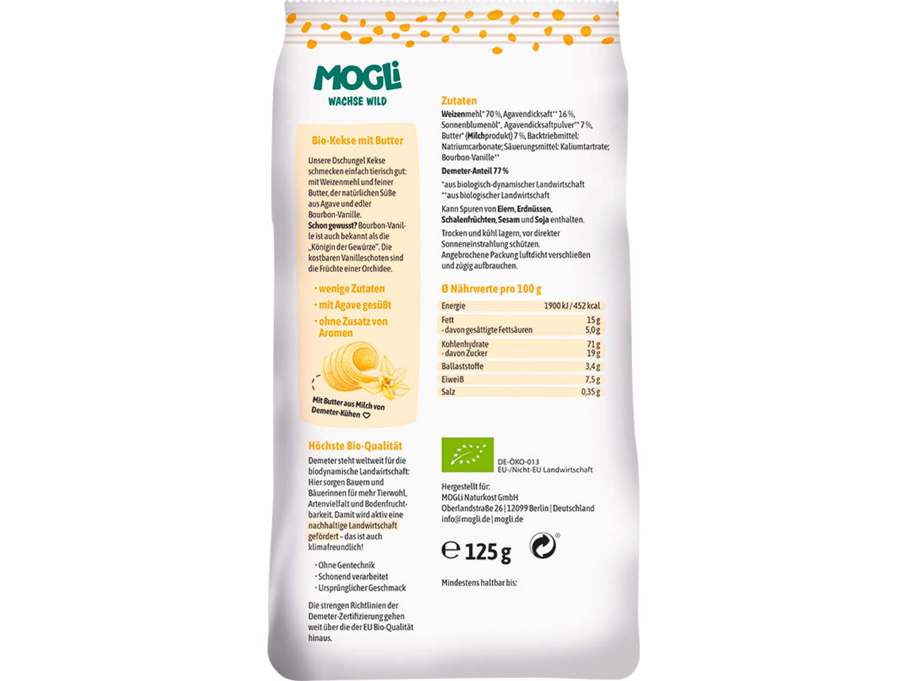Die MOGLi Dschungel-Kekse schmecken natürlich gut! Sie enthalten Weizenmehl aus biologisch-dynamischem Anbau, sind mit bester Demeter-Butter verfeinert und mit Agave gesüßt. Ein Hauch von aromatischer Bourbon Vanille rundet den Geschmack des leckeren Gebäcks perfekt ab. So sind die natürlichen Kekse frei von sonstigen Aromen und überzeugen mit den ausgewählten Zutaten aus ökologischem Anbau und der traditionellen Rezeptur. Inhalt 125 g.