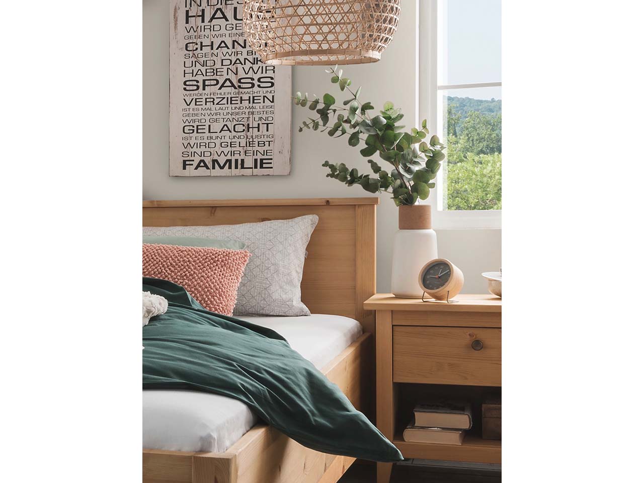 Perfekt als Ergänzung zum gleichnamigen Bett: Dieser Nachttisch dient als praktisches Zubehör im Schlafzimmer. Die kleine Kommode bietet eine Ablagefläche, eine Schublade sowie ein offenes Fach. So lassen sich Dinge wie eine Blumenvase, ein Buch, das Smartphone, etc. ordentlich und griffbereit ablegen. Die Schublade und das Fach sorgen derweil für die ordentliche Unterbringung von Kleinigkeiten. Der modern gehaltene Nachttisch aus massivem, FSC-zertifiziertem Kiefernholz fügt sich aufgrund seiner Optik perfekt ins Schlafzimmer ein und bereitet über viele Jahre Freude. B 58 x T 40 x H 51 cm.