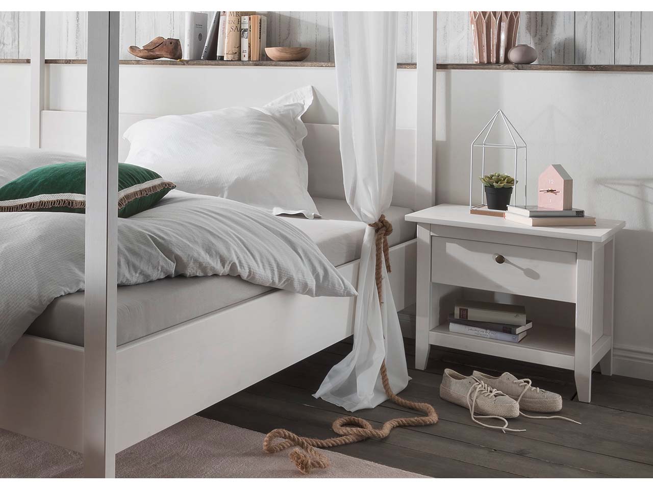 Perfekt als Ergänzung zum gleichnamigen Bett: Dieser Nachttisch dient als praktisches Zubehör im Schlafzimmer. Die kleine Kommode bietet eine Ablagefläche, eine Schublade sowie ein offenes Fach. So lassen sich Dinge wie eine Blumenvase, ein Buch, das Smartphone, etc. ordentlich und griffbereit ablegen. Die Schublade und das Fach sorgen derweil für die ordentliche Unterbringung von Kleinigkeiten. Der modern gehaltene Nachttisch aus massivem, FSC-zertifiziertem Kiefernholz fügt sich aufgrund seiner Optik perfekt ins Schlafzimmer ein und bereitet über viele Jahre Freude. B 58 x T 40 x H 51 cm.