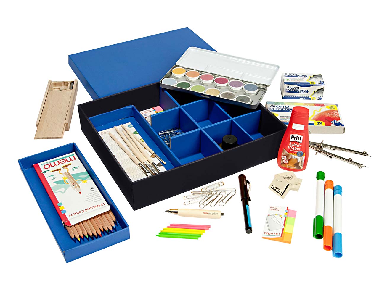 Eine innovative Idee, die für Ordnung unter jedem Pult sorgt. Die flache Form der Kleinteilebox passt unter nahezu jeden Schultisch. Die variable Innenaufteilung mit zwei herausnehmbaren Schalen bietet viel Platz - z. B. für A4-Zeichenblock, Schnellhefter und Wasserfarbkasten. Ein Deckel verschließt die Box und schützt den Inhalt vor Staub.