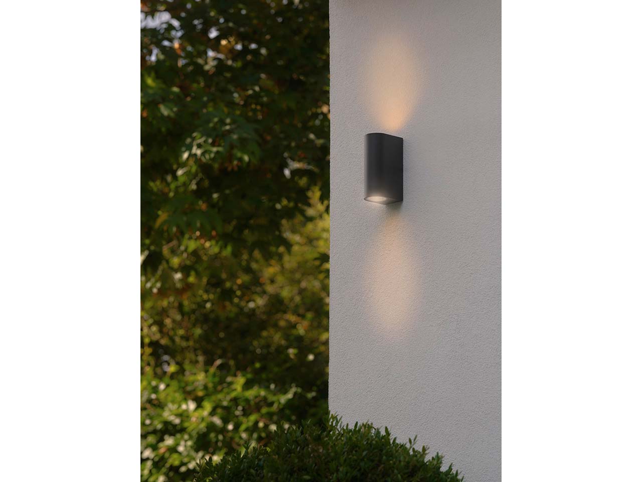 Modernes, geschwungenes Design für die Hausfassade, die Auffahrt oder den Haupteingang: Die elegante Wandleuchte sorgt für nach oben und unten gerichtetes Licht. Dabei ist eine seitliche Kabelführung möglich. Die Aluminium-Wandleuchte für den Außenbereich hat einen GU10-Leuchtmittelsockel und wird ohne Leuchtmittel geliefert.