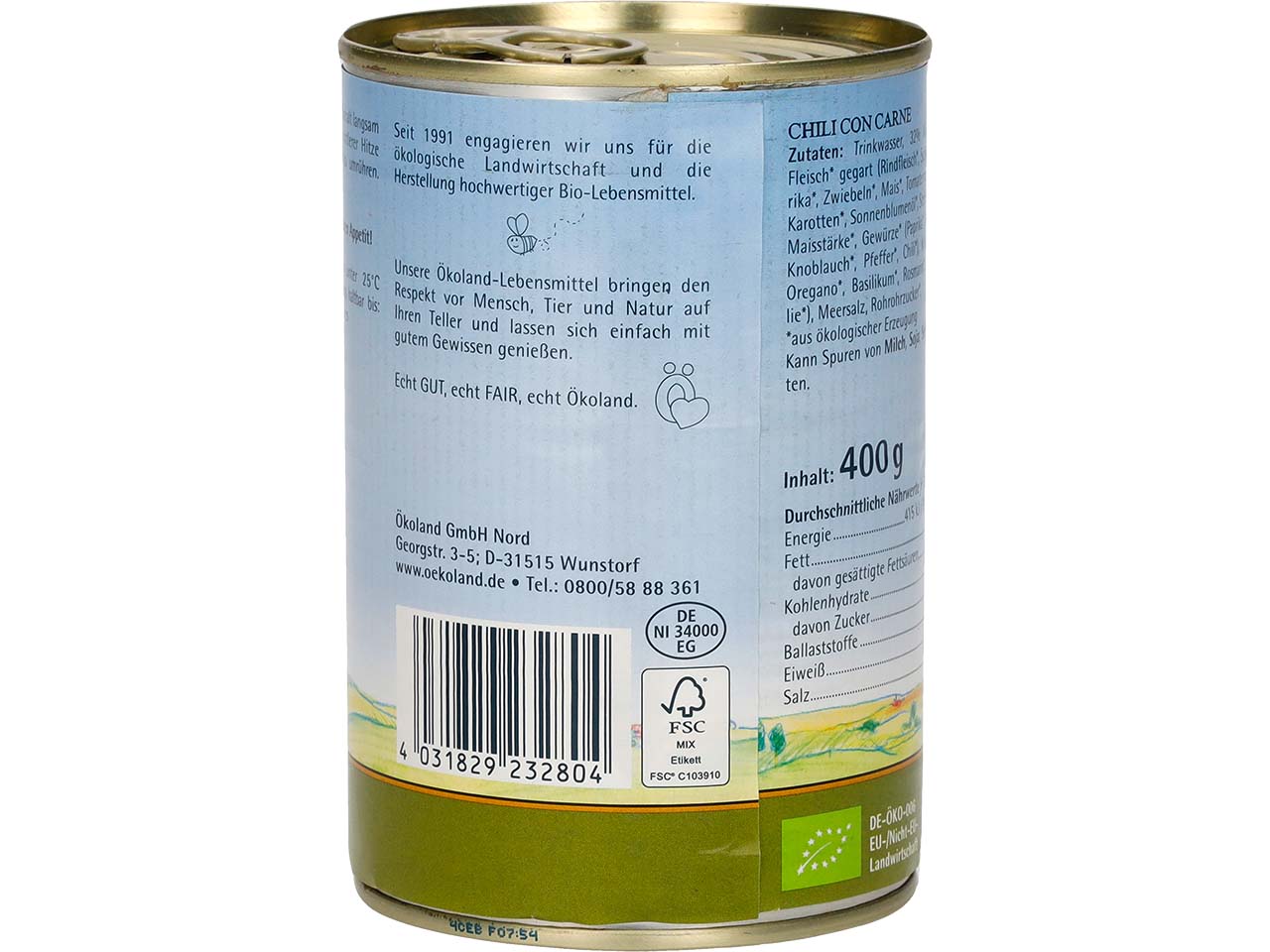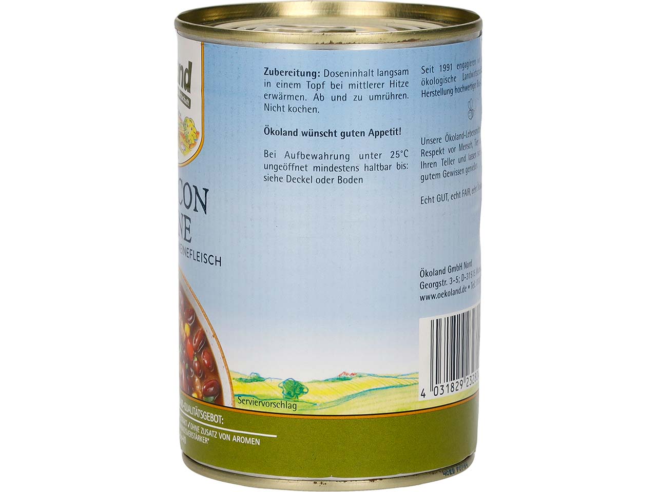 Genuss nach mexikanischer Art! Das Chili con Carne von Ökoland ist eine köstliche Mahlzeit mit vielen Kidneybohnen, Mais, Paprika sowie Rind- und Schweinefleisch. Die Zutaten aus kontrolliert ökologischer Erzeugung sind perfekt aufeinander abgestimmt. Durch Kräuter und Gewürze entsteht der einzigartige Geschmack. Hier sind weder Hefeextrakt noch Aromen oder Geschmacksverstärker verarbeitet. Ungeöffnet ist das Bio-Chili con carne lange haltbar – und immer eine gute Wahl, wenn es in der Küche schnell gehen muss!
