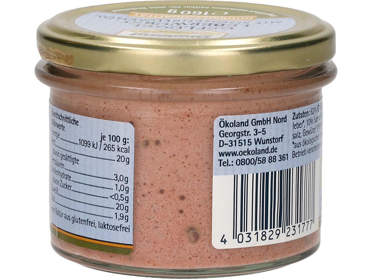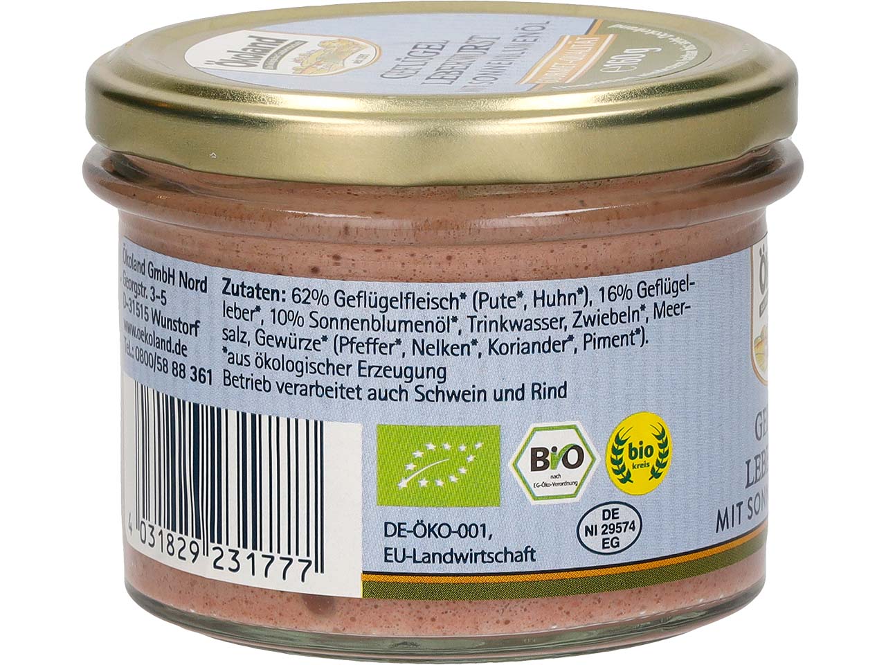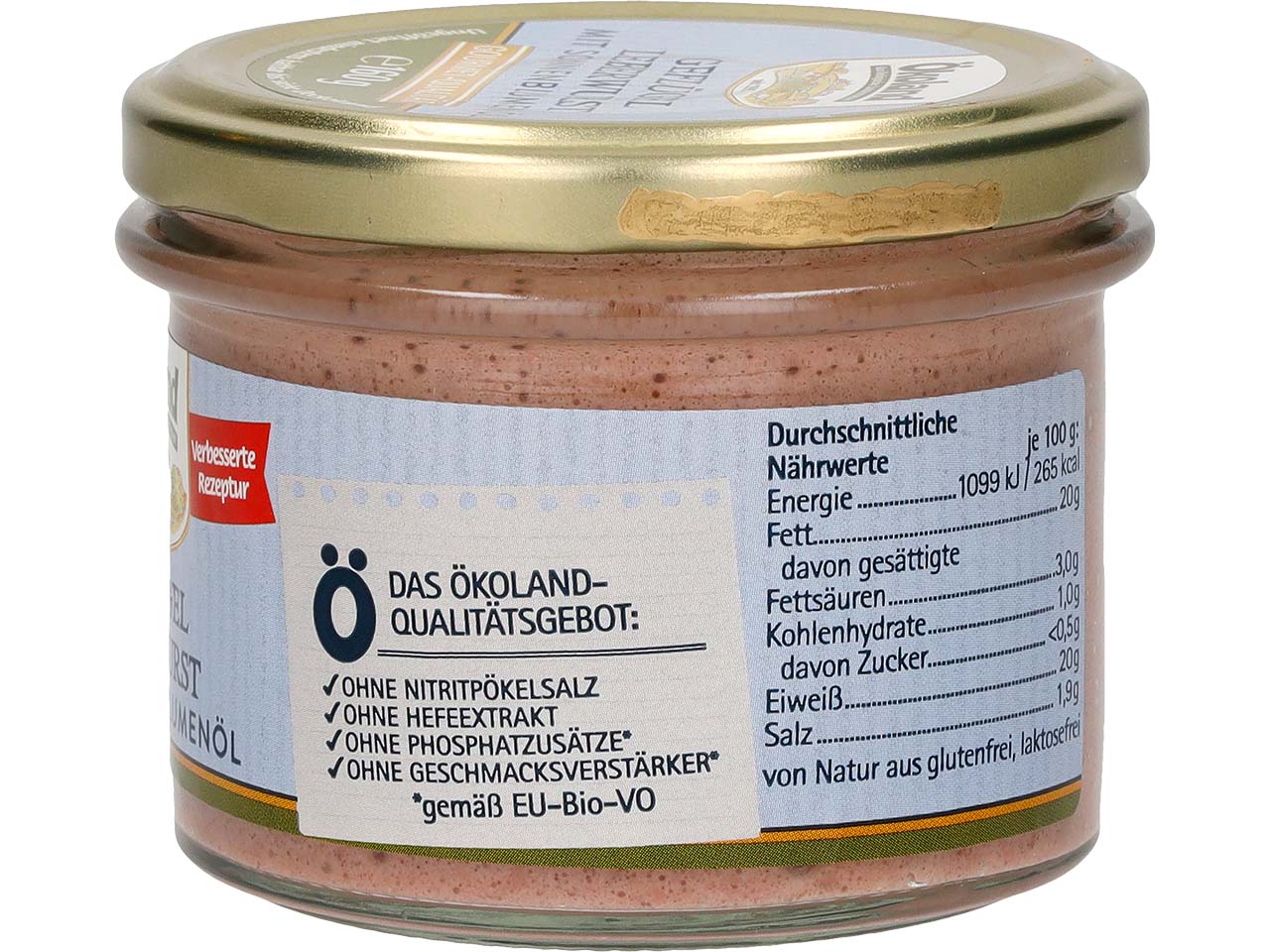 Perfekt für Frühstück und Brunch: Die Geflügel-Leberwurst von Ökoland hat Gourmet-Qualität und enthält hochwertiges Bio-Geflügelfleisch sowie Bio-Geflügelleber. Traditionelle Gewürze sorgen für den herzhaften Geschmack. Dank Sonnenblumenöl hat die Leberwurst eine feine, streichfähige Konsistenz. Das Zylinderglas ermöglicht eine einfache Entnahme. Es kann direkt auf den gedeckten Tisch gestellt werden.