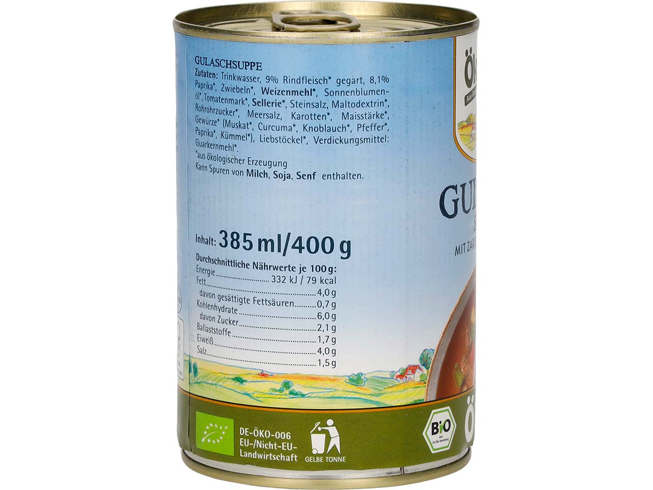Diese Köstlichkeit aus der Dose ist nach dem Vorbild der Magyaren-Küche entstanden. Die Gulaschsuppe enthält hochwertige Zutaten wie würzige Gemüsepaprika aus kontrolliert biologischem Anbau. Es ist viel leckeres Rindfleisch in Bio-Qualität enthalten. Die Gulaschsuppe ist schnell und einfach zubereitet. Sie enthält keine zugesetzten Aromen oder Geschmacksverstärker und ist auch eine perfekte Ergänzung zu Reis, Nudeln oder Kartoffeln.