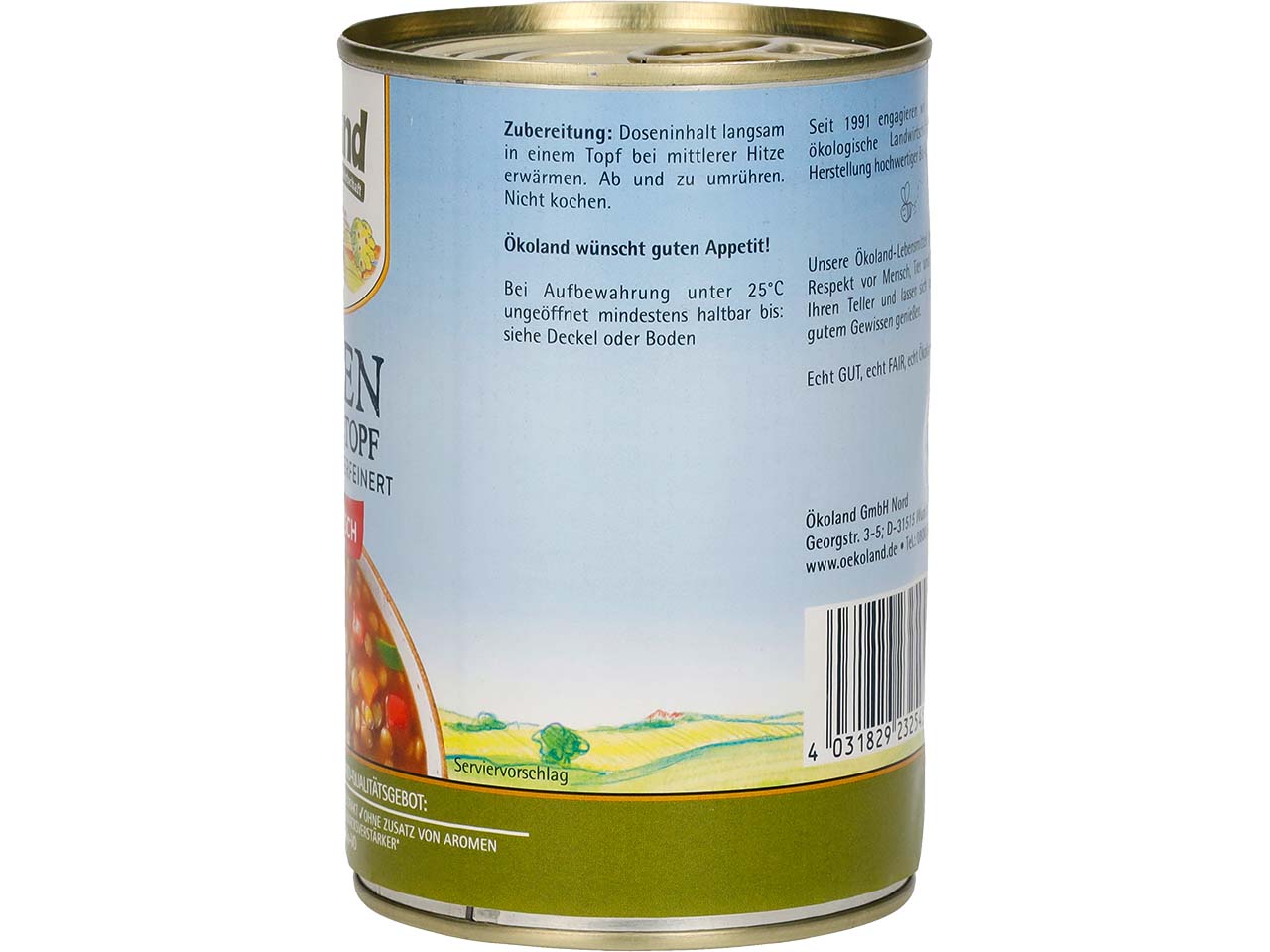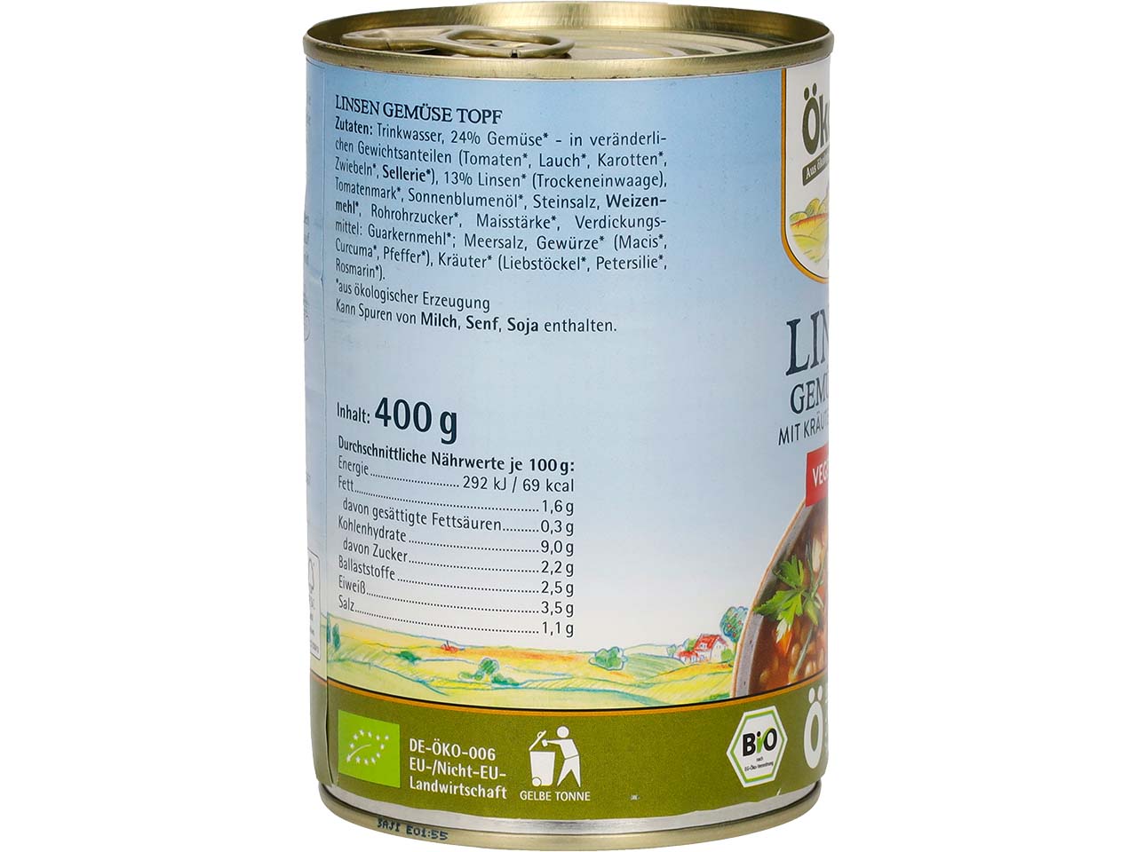 In dieser vollwertigen Mahlzeit steckt ganz viel Gutes und Leckeres: Linsen gehören zu den ältesten kultivierten Hülsenfruchtarten und gelten als hochwertige Eiweißquelle. Dazu gesellt sich ganz viel knackiges, köstliches Gemüse. Die Zutaten im vegetarischen Gemüsetopf stammen aus kontrolliert biologischem Anbau. Ungeöffnet ist die Mahlzeit lange ungekühlt haltbar. Hefeextrakt oder zusätzliche Aromen sind hier nicht verarbeitet.