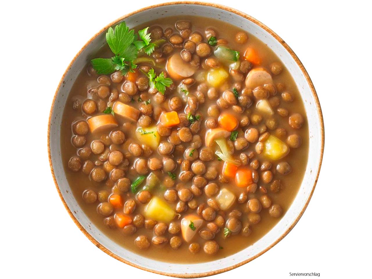 - Kräftige Linsensuppe mit Würstchenscheiben