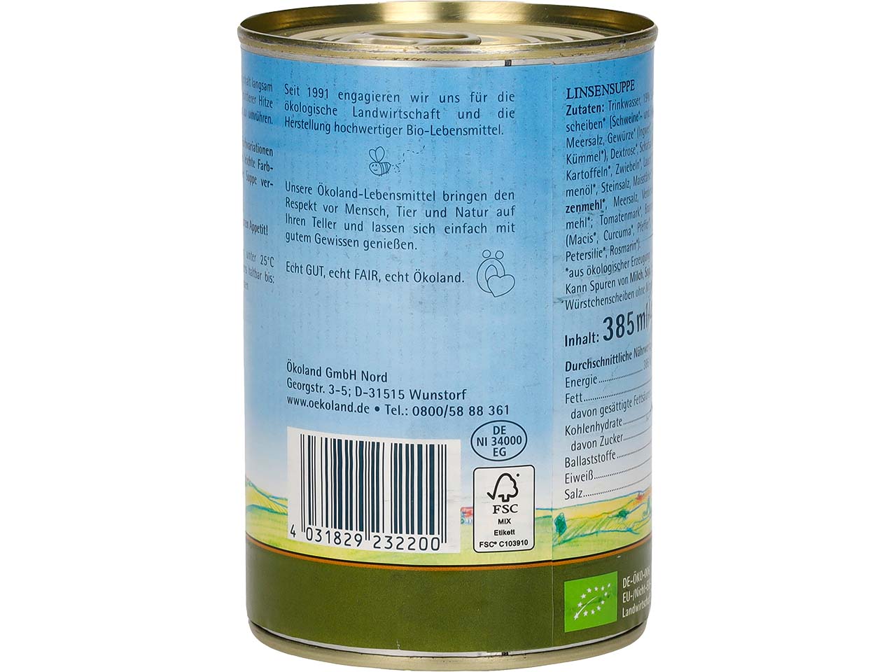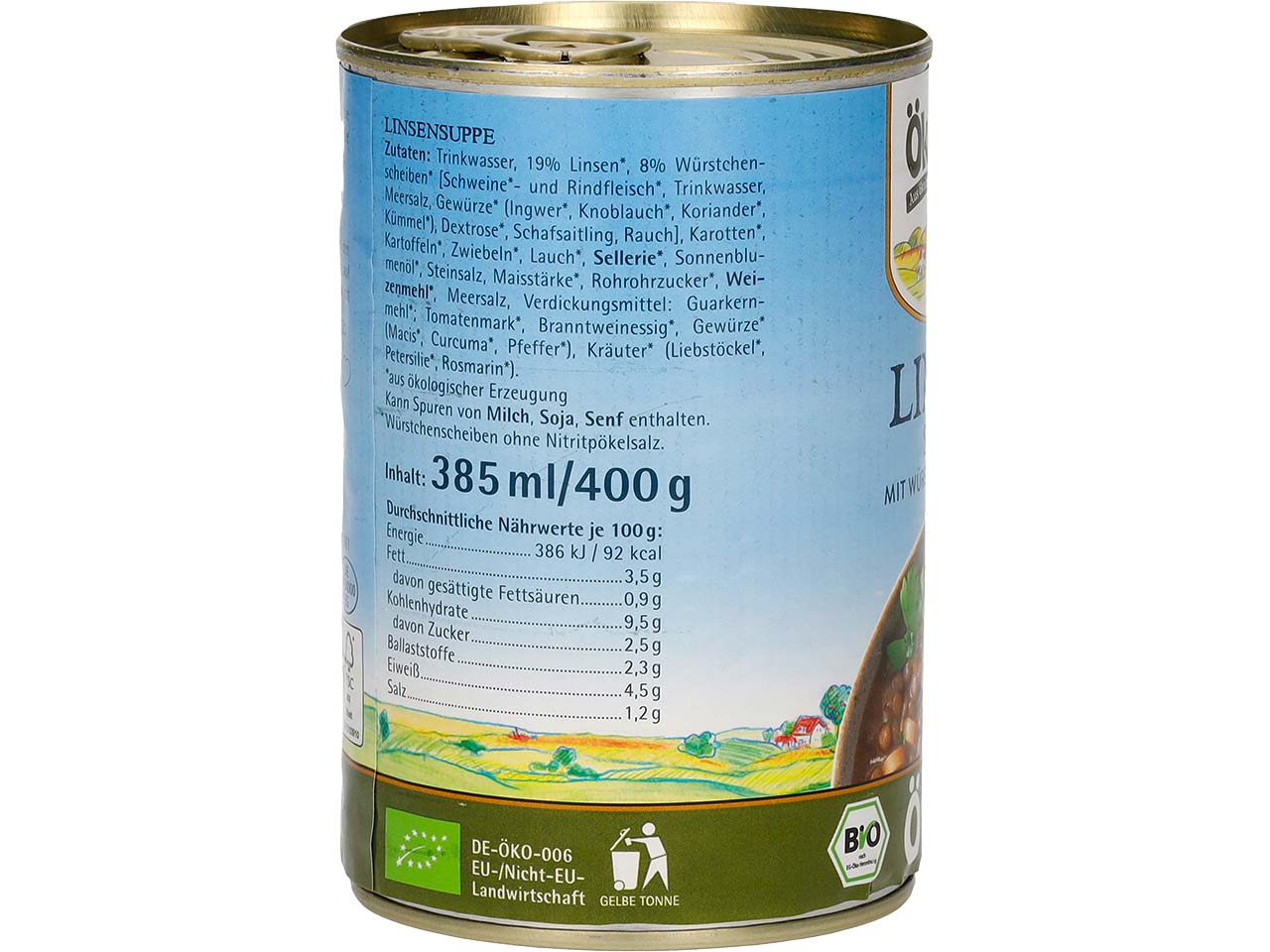Trinkwasser, 19% Linsen*, Fleisch (Schwein*, Rind*), Karotten*, Kartoffeln*, Zwiebeln*, Lauch*, SELLERIE*, Sonnenblumenöl*, Steinsalz, Maisstärke*, Rohrohrzucker*, WEIZENMEHL*, Meersalz, Verdickungsmittel: Guarkernmehl*; Tomatenmark*, Branntweinessig*, Gewürze* (Macis*, Curcuma*, Pfeffer*, Ingwer*, Knoblauch*, Koriander*, Kümmel*), Kräuter*(Liebstöckel*, Petersilie*, Rosmarin*), Dextrose*, Schafsaitling, Rauch *aus kontrolliert ökologischer Erzeugung |