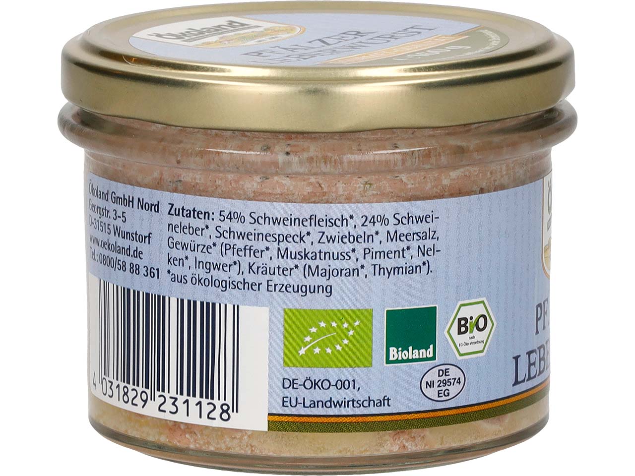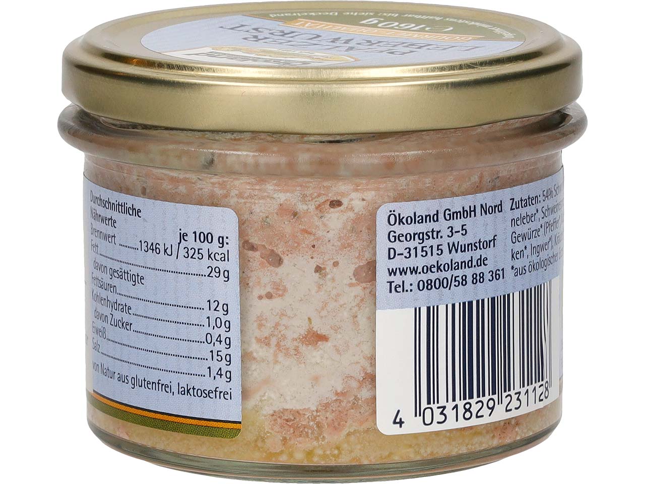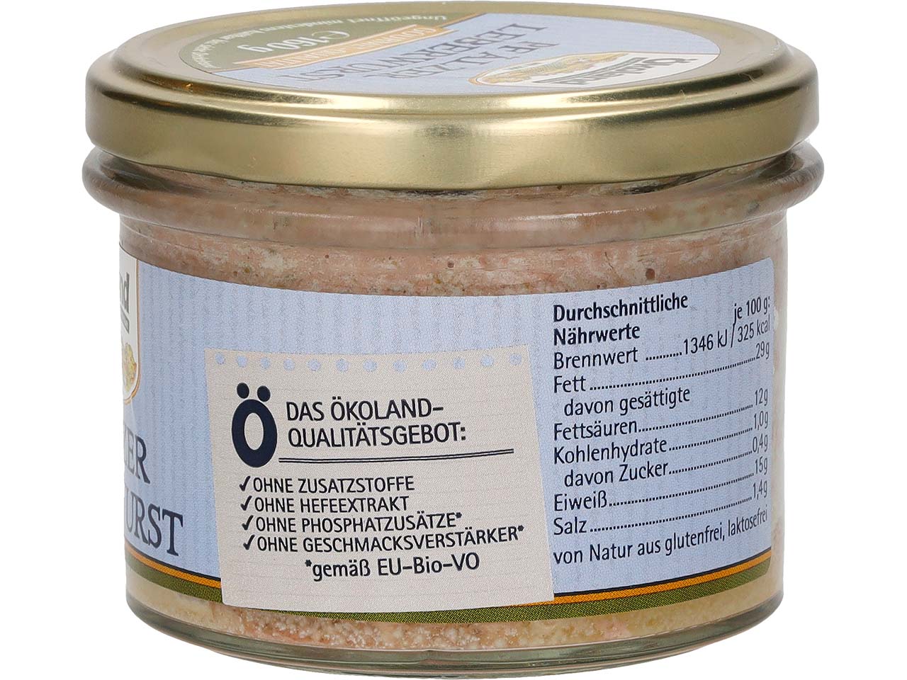 54% Schweinefleisch*, 24% Schweineleber*, Schweinespeck*, Zwiebeln*, Meersalz, Gewürze* (Pfeffer*, Muskatnuss*, Piment*, Nelken*, Ingwer*), Kräuter* (Majoran*, Thymian*) *aus kontrolliert ökologischer Erzeugung |