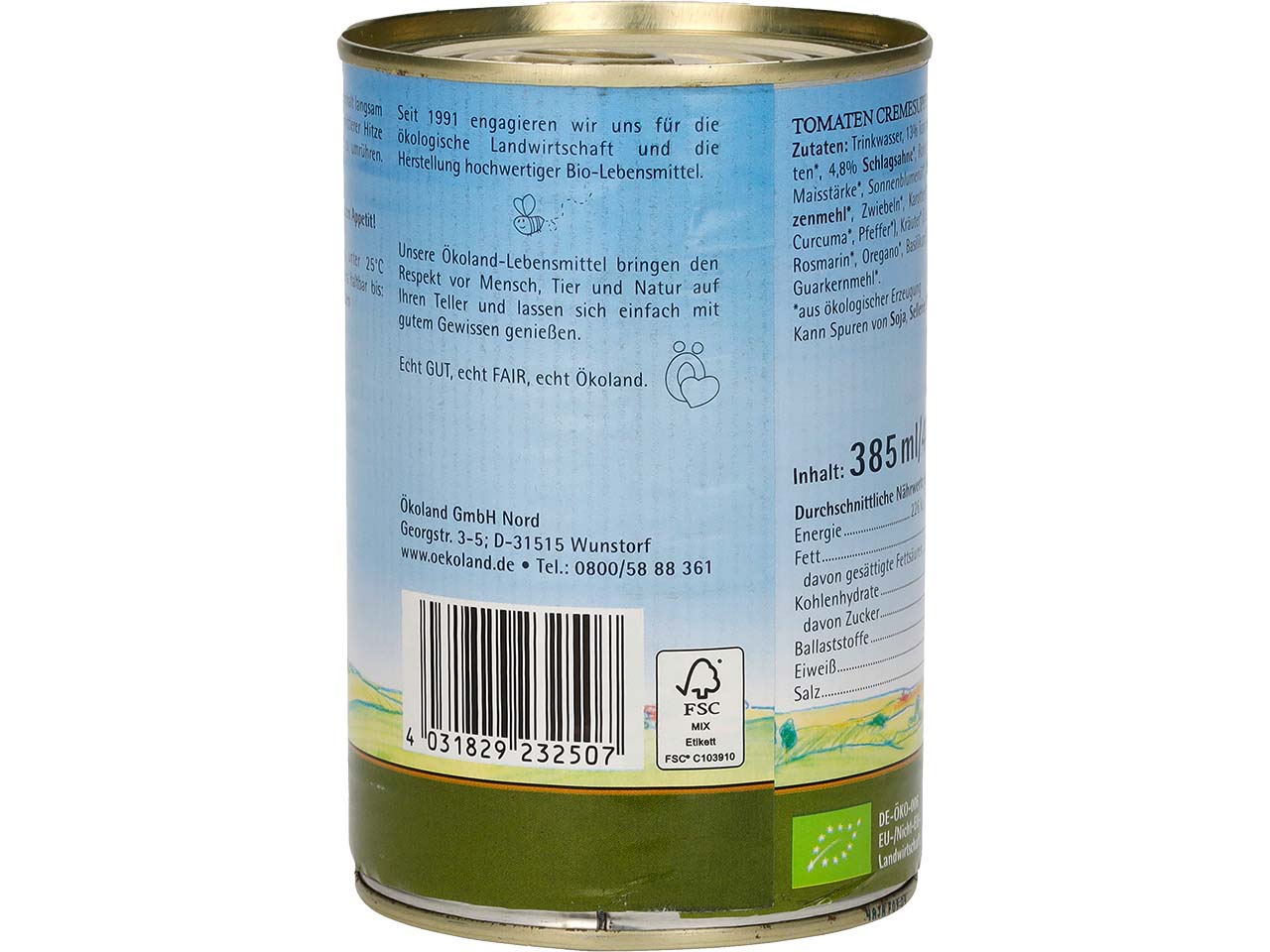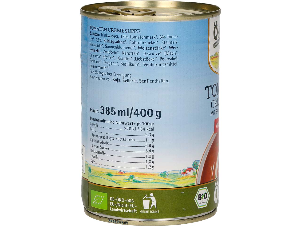Trinkwasser, 13% Tomatenmark*, 6% Tomaten*, 4,8% SCHLAGSAHNE*, Rohrohrzucker*, Steinsalz, Maisstärke*, Sonnenblumenöl*, WEIZENSTÄRKE*, WEIZENMEHL*, Zwiebeln*, Karotten*, Gewürze* (Macis*, Curcuma*, Pfeffer*), Kräuter* (Liebstöckel*, Petersilie*, Rosmarin*, Oregano*, Basilikum*), Verdickungsmittel: Guarkernmehl* *aus kontrolliert ökologischer Erzeugung |
