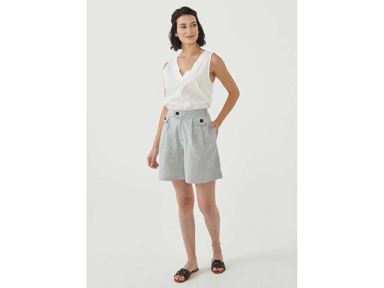 Hat jemand „Retro-Charme“ gesagt? Diesen bringt diese kurze Hose von ORGANICATION aus 100 % GOTS-zertifizierter Bio-Baumwolle auf jeden Fall mit sich! Der hohe Schnitt und die Bundfalten sorgen nicht nur für einen optimalen Sitz, sondern lassen uns auch in der Zeit reisen. Aber keine Sorge: Die Hose mit leichtem Nadelstreifenmuster muss ganz und gar nicht altbacken wirken! Frau stylt dieses tolle Teil einfach mit einem lässigen T-Shirt, einer weißen Bluse oder Sneakern und schon steht das schicke Sommeroutfit mit dem gewissen Extra.
