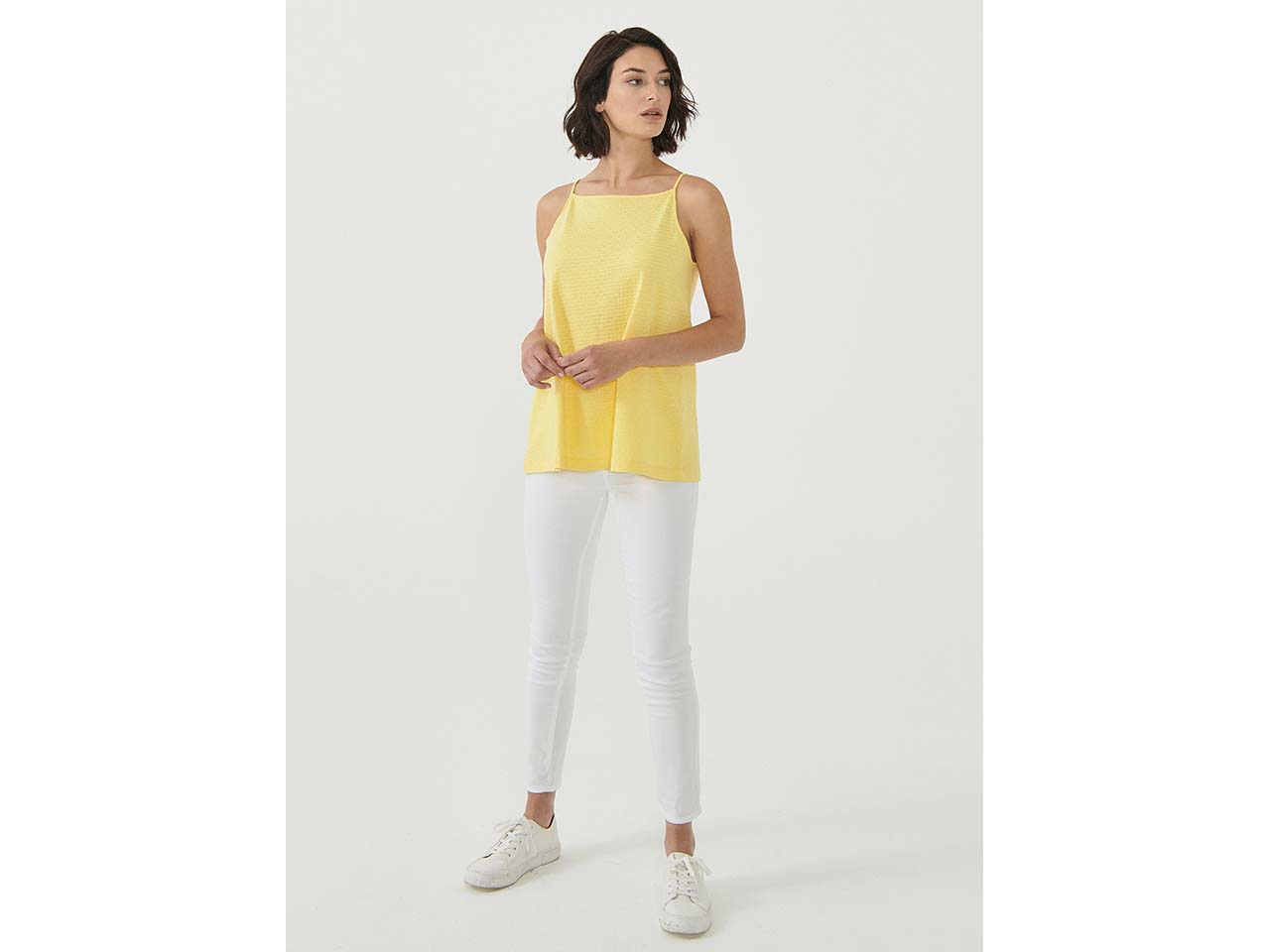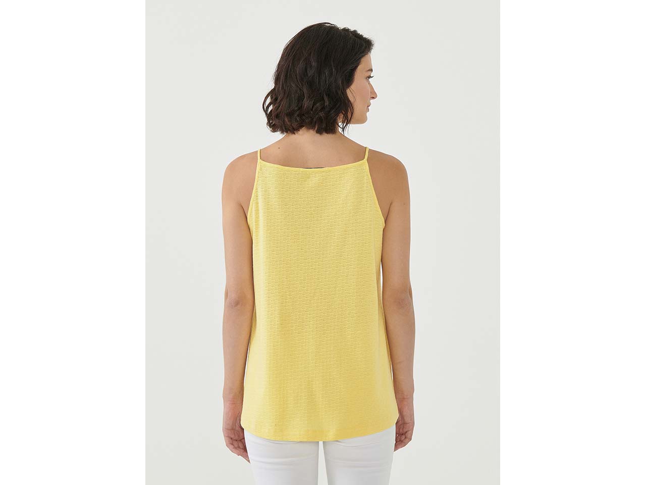 Anziehen und Wohlfühlen: Das luftig leichte Top mit Waffelpiqué-Struktur von ORGANICATION sorgt an heißen Tagen dafür, dass Frau nicht ins Schwitzen gerät und sich trotzdem gut angezogen fühlt. Daher ist das Top aus GOTS-zertifizierter Bio-Baumwolle nicht nur für die Freizeit, sondern auch perfekt für das Büro geeignet. Durch den lockeren, kastigen Schnitt hat es zudem eine lockere Passform und bringt dennoch mit den filigranen Spaghetti-Trägern das gewisse Extra an Eleganz mit sich. Ob reingesteckt oder nicht: es lässt sich wunderbar zu Rock, zu Jeans und auch zu Stoffhosen kombinieren.