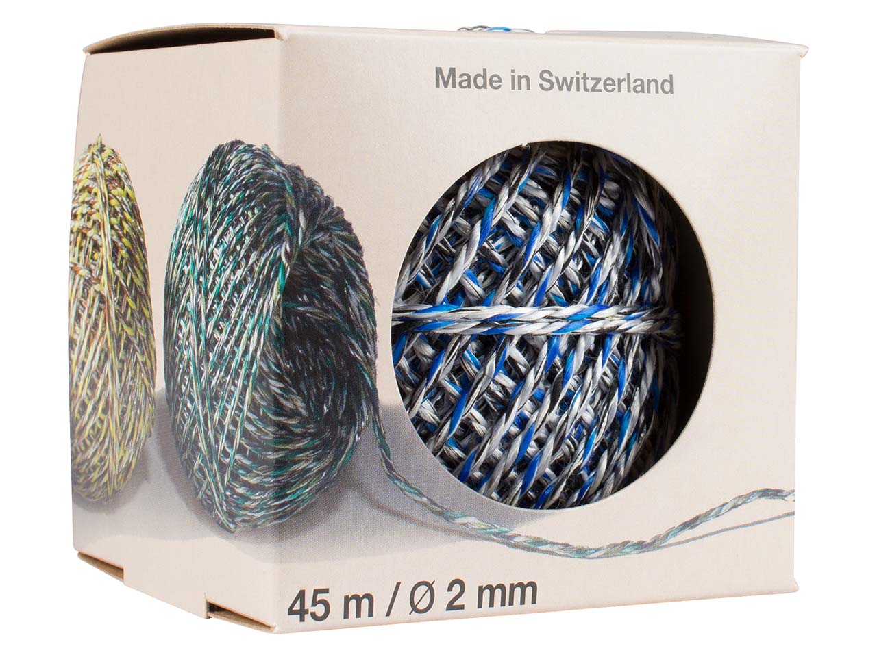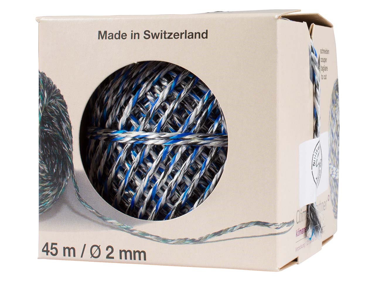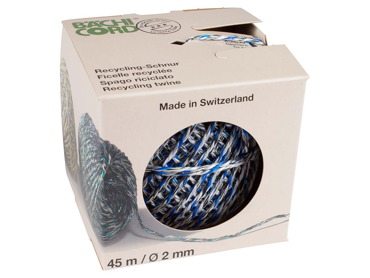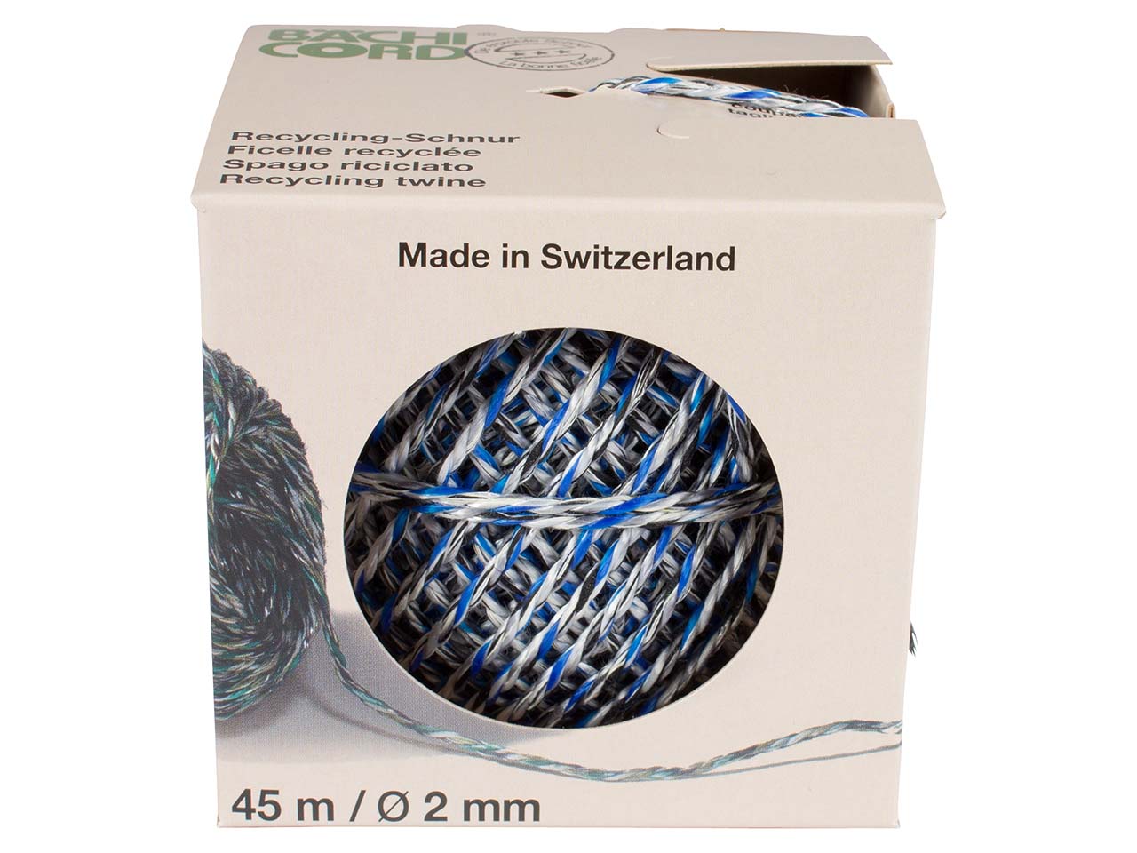 Schnell, einfach und universell: Die Recycling-Packschnur ist in der Pappbox nicht nur gut verstaut, Box und Trennklinge ermöglichen zudem ein präzises und einfaches Abtrennen der Schnur. Die Packschnur wird aus farbigen Zwirn- und Garnabfällen aus der Textilindustrie gefertigt, trägt bis zu 9 kg und ist sehr reißfest (45 kg). L 45 m.