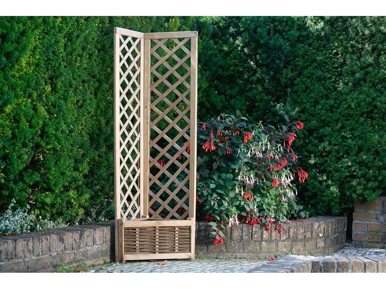 Setzen Sie den dreieckigen, platzsparenden Pflanzkasten mit Rankgitter auf Balkon oder Terrasse. Durch die Pergolagitter erhalten rankende Pflanzen optimalen Halt und es entsteht ein effektiver, grüner Sichtschutz. Die Kombination aus stabilem, lasiertem Kiefernholz und Weidenruten sorgt für eine sehr ansprechende Optik. Der Kasten ist mit reißfester Kunststofffolie versehen. B 50 x T 50 x H 30/140 cm.