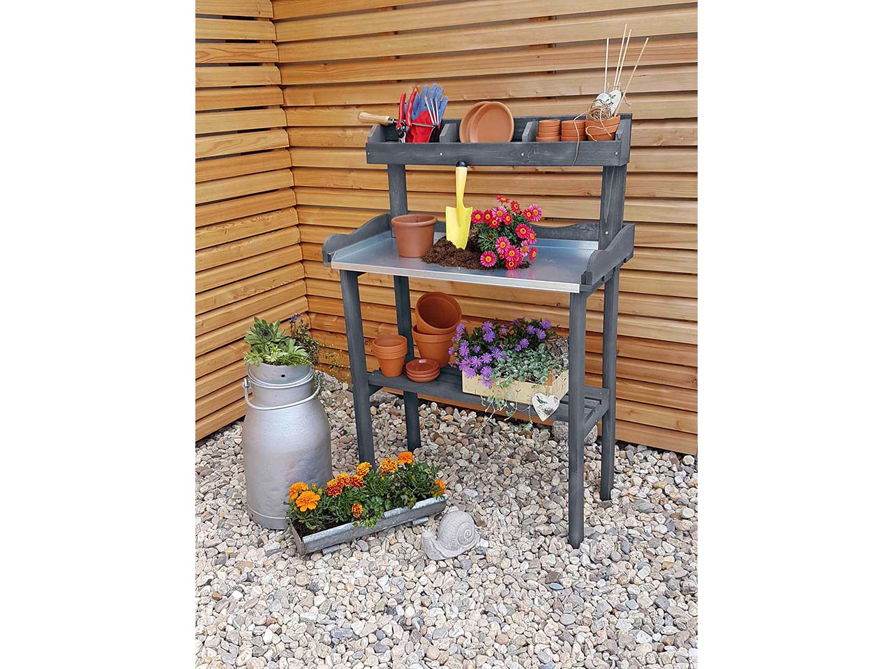 Ebenso praktisch wie gutaussehend: Dieser stabile Pflanztisch bietet neben großzügiger Arbeitsplatte viel Ablage- und Aufbewahrungsfläche! Ob auf der Terrasse oder im Gewächshaus: Der Tisch aus massivem, FSC-zertifiziertem Kiefernholz ist überall ein echter Gewinn. Die untere Ablage eignet sich hervorragend, um Gärtnerbedarf wie Gießkanne, unbenutzte Pflanztöpfe, etc. platzsparend unterzubringen. In der oberen Ablage ermöglichen die Zwischenfächer ein besonders übersichtliches, ordentliches Verstauen verschiedener Gegenstände wie Saatbeutel, Gartenhandschuhe und Werkzeug. Die Arbeitsfläche ist verzinkt, sodass darauf optimal gearbeitet werden kann. Das Holz ist wetterfest imprägniert und hält so jede Jahreszeit aus. B 84 x T 38 x H 130 cm.
