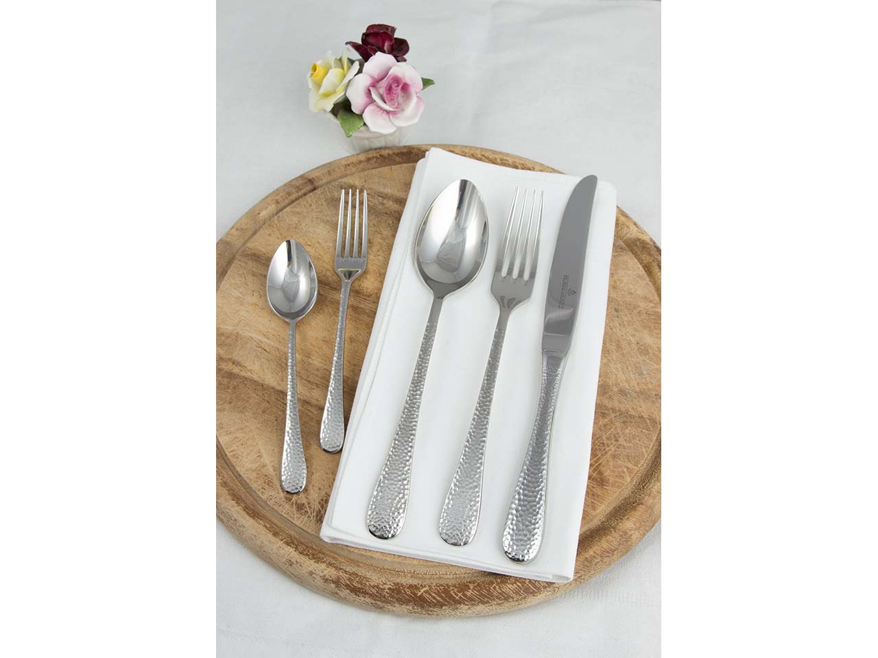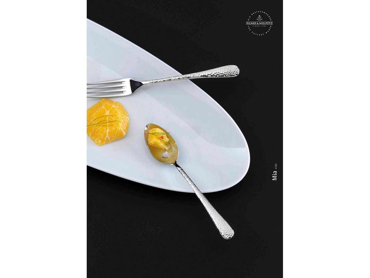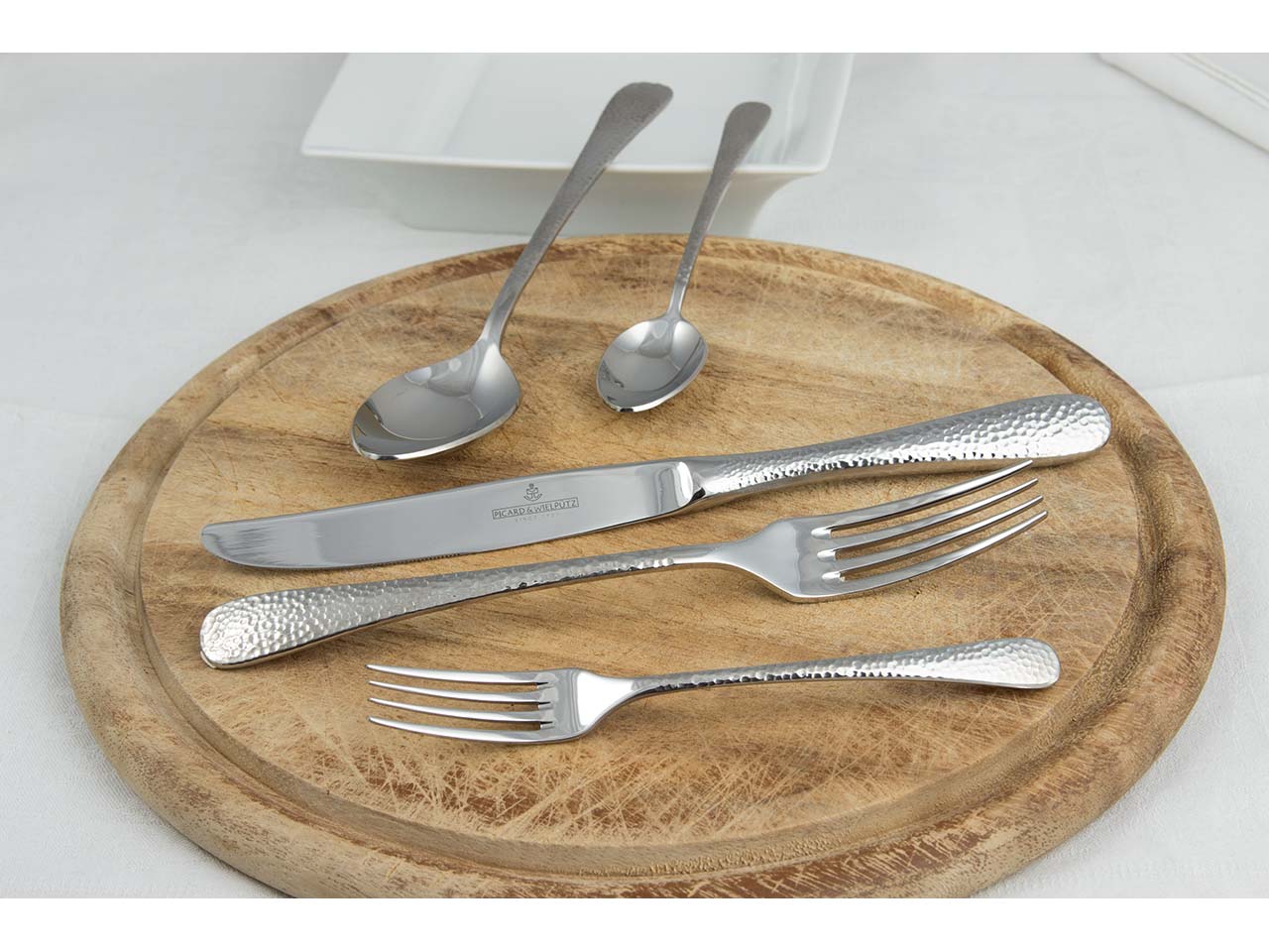 Das edle, 24-teilige Besteck "Mia" wird vom Traditionsunternehmen Picard & Wielpütz in Solingen hergestellt. Gabeln und Löffeln bestehen aus Edelstahl 18/10 und die Messer aus Chromstahl 18/10. Das Design überzeugt mit einer Oberfläche in Hammerschlagoptik, auf der Fingerabdrücke weniger sichtbar sind. Das Besteck hat eine hohe Materialstärke von 3,5 mm und liegt exzellent in der Hand. 1 Set = 6 Menülöffel, 6 Menügabeln, 6 Menümesser massiv, 6 Kaffeelöffel.