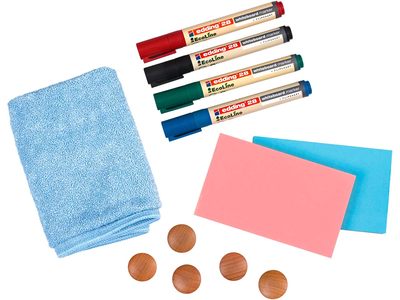 2x Haftnotizen, 5 Magnete mit Holzkopf, 40 Klebepunkte blau, 40 Klebepunkte rot, 5 edding Whiteboard-Marker "EcoLine" (2x rot, 1x blau, 1x grün, 1x schwarz), praktische Aufbewahrungsbox. |