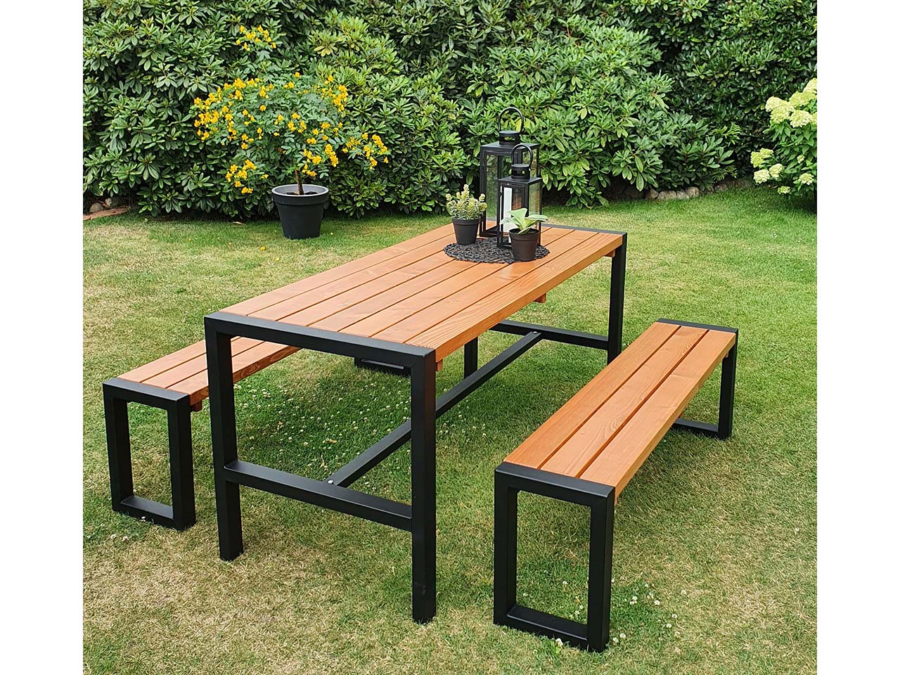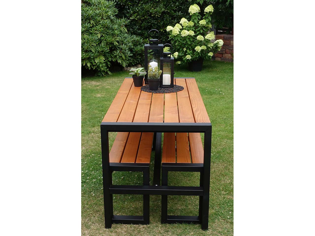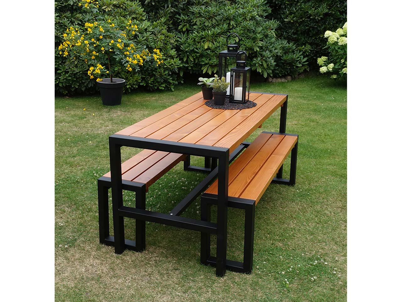 Die perfekte Symbiose aus Natürlichkeit, zeitloser Formensprache und Stabilität: Das Gartenmöbel-Set bestehend aus einem Tisch und zwei Bänke bereichert Gärten und Terrassen. Gefertigt sind die Möbel aus FSC-zertifiziertem, massivem Kiefernholz und pulverbeschichtetem Stahl. Die 6 x 4 cm starken Metallelemente sind es, die der Sitz-Garnitur ihre hervorragende Stabilität und Robustheit verleihen. Die Kombination aus Holz und Metall sorgt außerdem für eine spannende Optik. Zu dieser trägt auch die 3-fache Lackierung bei, die das Set edel komplettiert und die Reinigung vereinfacht. Jede Bank bietet Platz für bis zu drei Personen, sodass dem nächsten Gartenfest nichts mehr im Wege steht! Set mit 1 Tisch, 2 Bänken.
