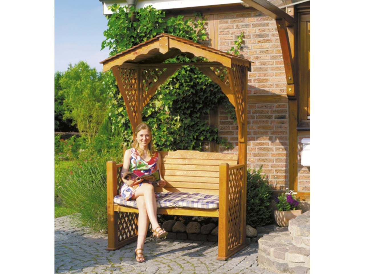 Mit einer überdachten Gartenbank können Sie die Natur so richtig genießen. Die kleine Gartenlaube aus Holz zeichnet sich durch ihre erstklassige Verarbeitung aus. Sie erhalten eine stabile Sitzgelegenheit, die zugleich noch mit Design begeistert. Die robuste Sitzfläche bietet viel Platz zum Entspannen und wird seitlich von detailreichen Abgrenzungen verziert.