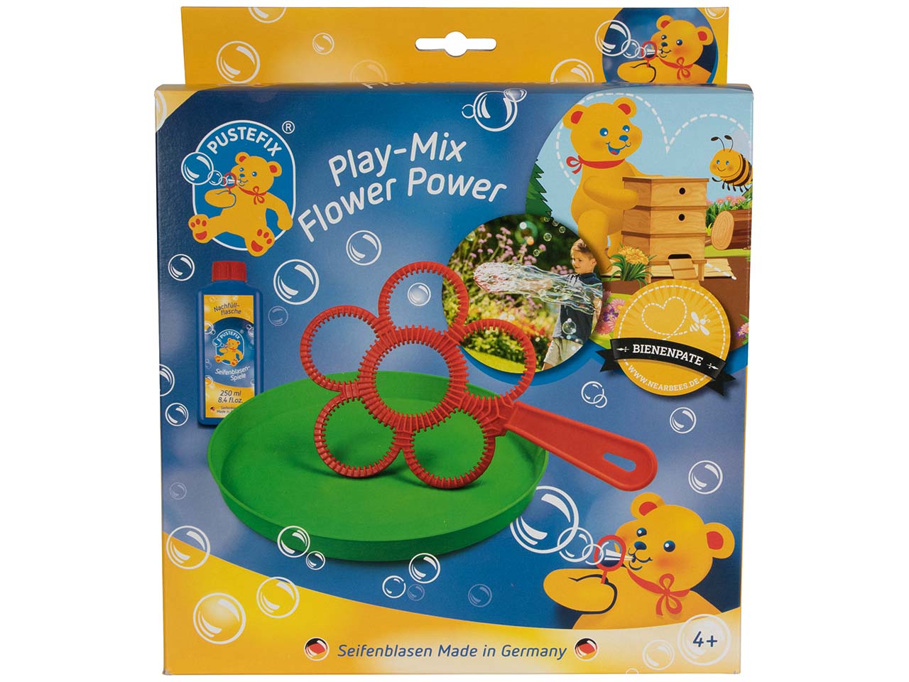 Hier sprießen Seifenblasen! Das kleine Set ist nicht nur perfekt für Natur-Fans. Entstanden ist es, weil PUSTEFIX eine Bienenpatenschaft in Zusammenarbeit mit nearBees übernommen hat. Blumen sind für die nektarsuchenden Bienchen überlebensnotwendig. Jetzt können Kinder ab 5 Jahren ihre eigenen Blumen aus Seifenblasen in die Welt schicken. In dem Set enthalten sind der Blasring in Blumenform, ein Teller und 350 ml PUSTEFIX Flüssigkeit.