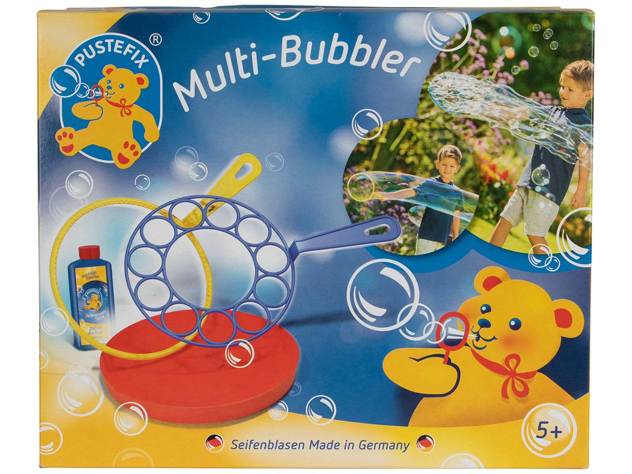 | Inhalt: | Großer gelber Ring, blauer Multi Ring, Flüssigkeitschale, 250 ml Seifenblasenflüssigkeit |